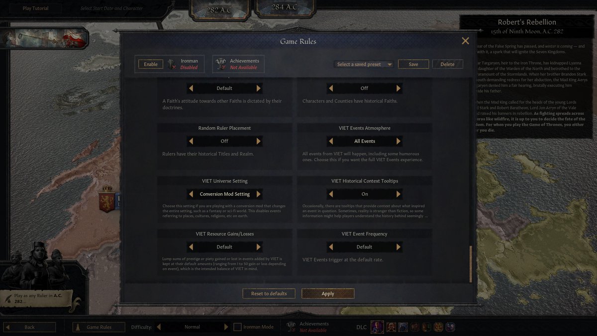 Стадия открытого тестирования означает, что многое ещё будут допиливать. Например, сейчас в моде нет драконов и континента Эссос. Также хотят сделать больше стартовых дат и особых механик.