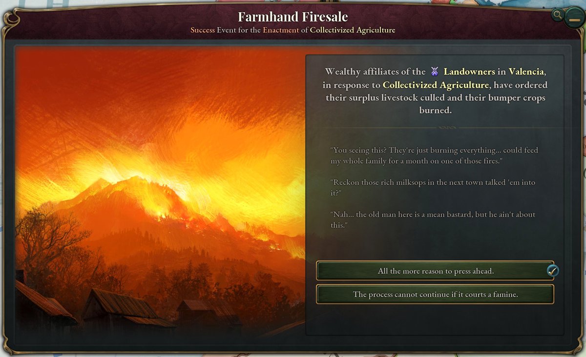 Всегда нужно понимать, что и при каких сильных заинтересованных группах вы делаете, иначе поля и скот начнут гореть. Впрочем, в игре нет конкретной цели, может вам именно оно и надо.