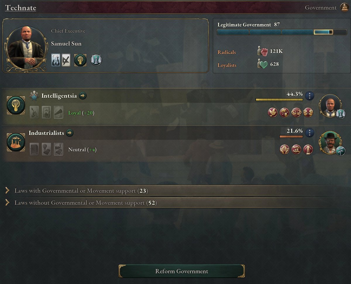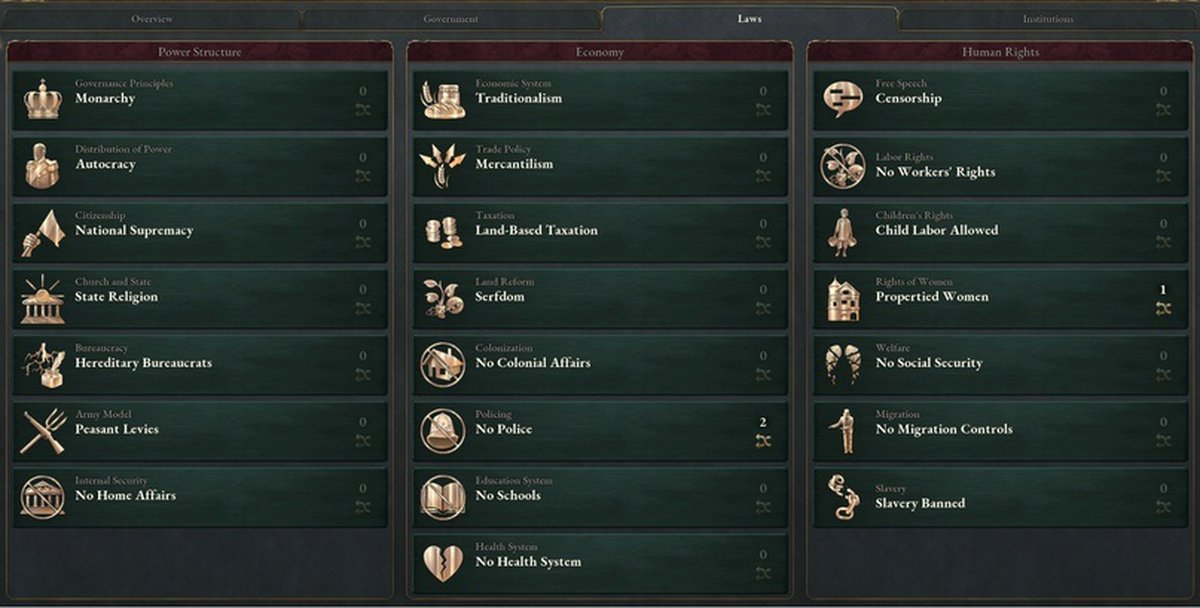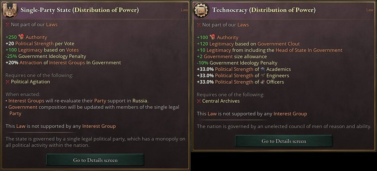 Ещё два закона появятся в обновлении 1.3 — «Технократия» и «Однопартийное государство». Они представляют более современную модель распределения власти, которую рассматривали или реализовали к концу временного периода игры. Оба закона дают значительное количество авторитета, а «Однопартийное государство» даёт самое большое количество авторитета в игре.