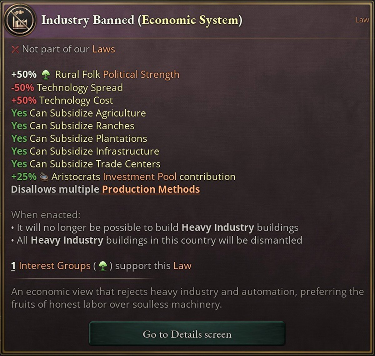Запрет промышленности значительно усилит селян, и благодаря отключению тяжёлой промышленности это также снизит влияние промышленников и усилит землевладельцев. Совместив «Приусадебные участки» и «Запрет индустрии», можно получить +75% к влиянию селян, тем самым создав аграрную, идиллическую державу, в которой власть находится в руках малоимущих селян.