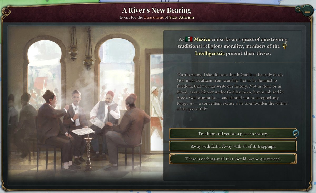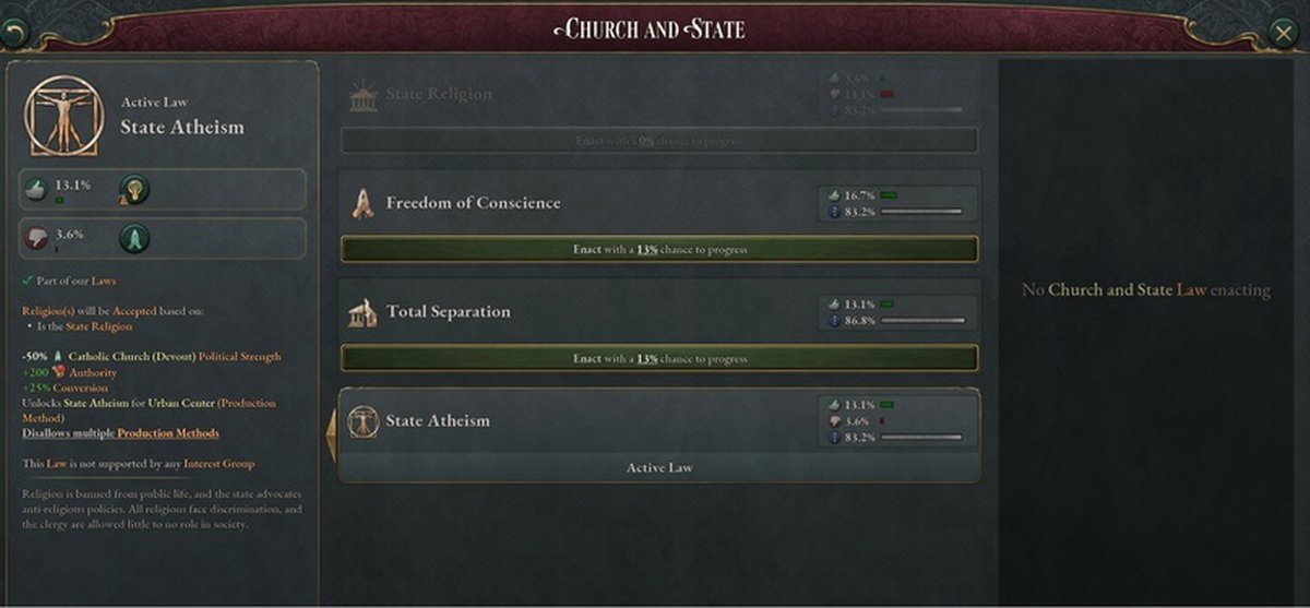 Также в новое время были страны, которые боролись с религией. Появится в игре государственный атеизм — абсолютное средство борьбы с влиянием духовенства в стране, запрещающее религию в общественной жизни и дискриминирующее все религии.