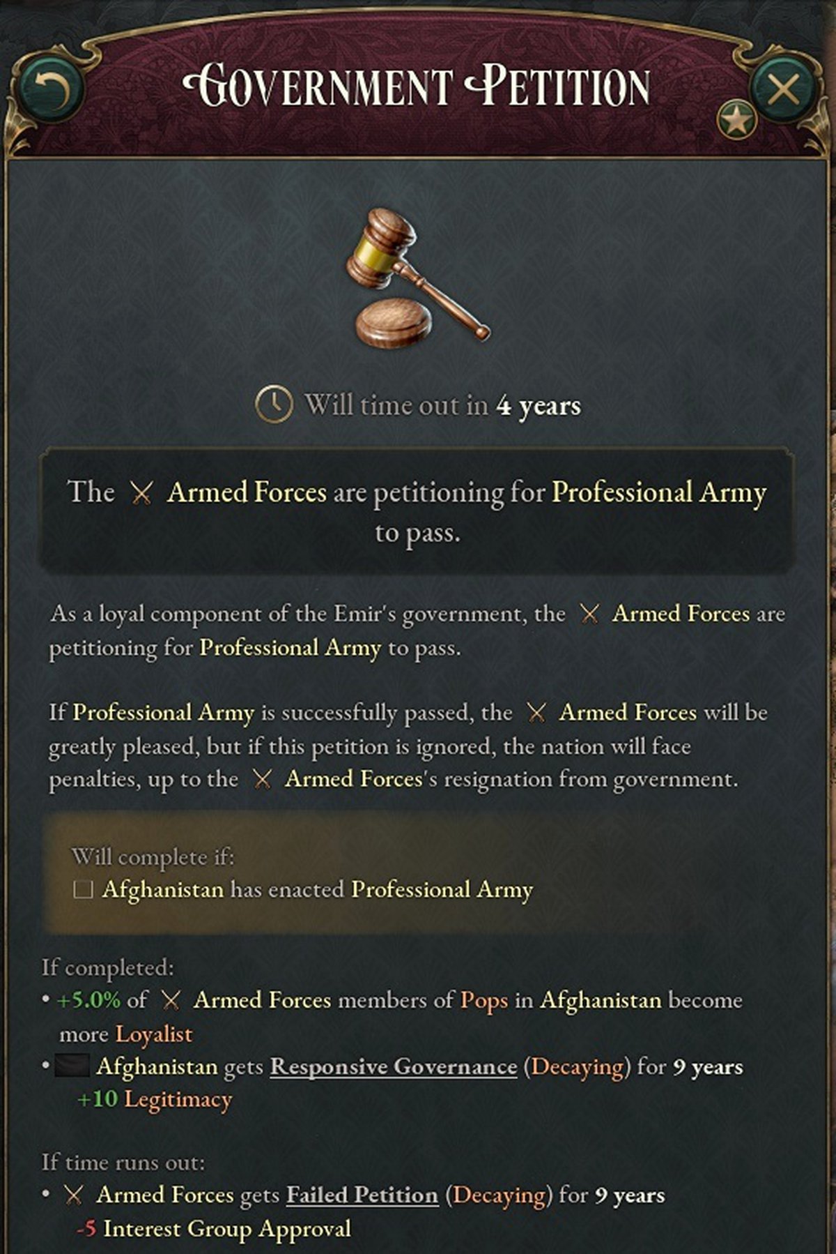 Появятся также государственные петиции. Это квесты, за выполнение которых можно получить бафф, за провал дебафф. Время на исполнение ограничено.