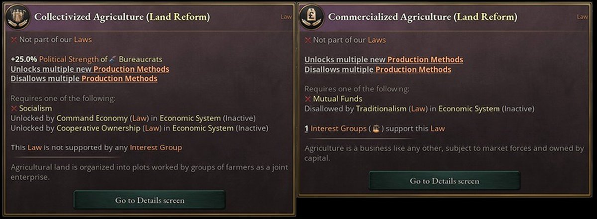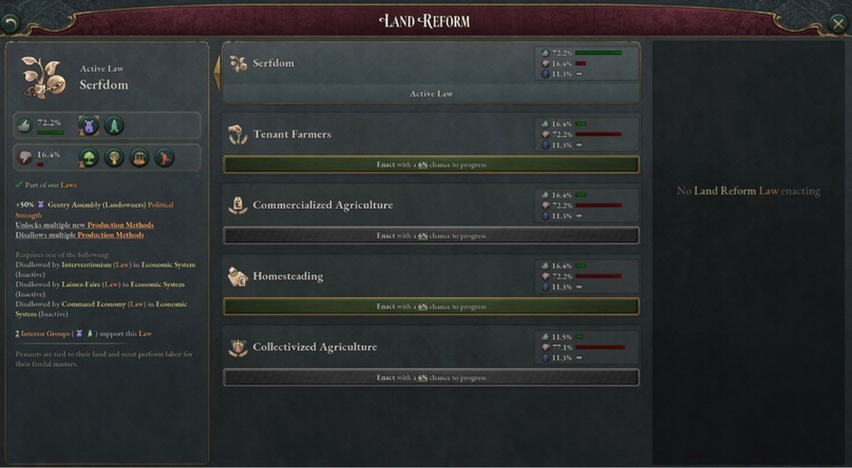 Новая категория законов представляет различные варианты прав собственности на землю, каждый из которых играет крайне важную роль в распределении политической силы между заинтересованными группами в вашей стране. Тогда как крепостное право и арендаторское землевладение серьёзно усиливают традиционные землевладельческие элиты, новый закон о приусадебных участках усиливает политическое влияние крестьянства и открывает новый производственный метод, снижающий присутствие аристократии на фермах и повышающий количество рабочих мест для фермеров.