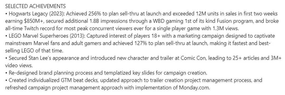 Продажи Hogwarts Legacy в первые дни и недели после релиза могли оказаться в несколько раз выше ожиданий Warner Bros. Об этом, заметил bogorad222, сообщается в профиле Ариана Дарби на LinkedIn.