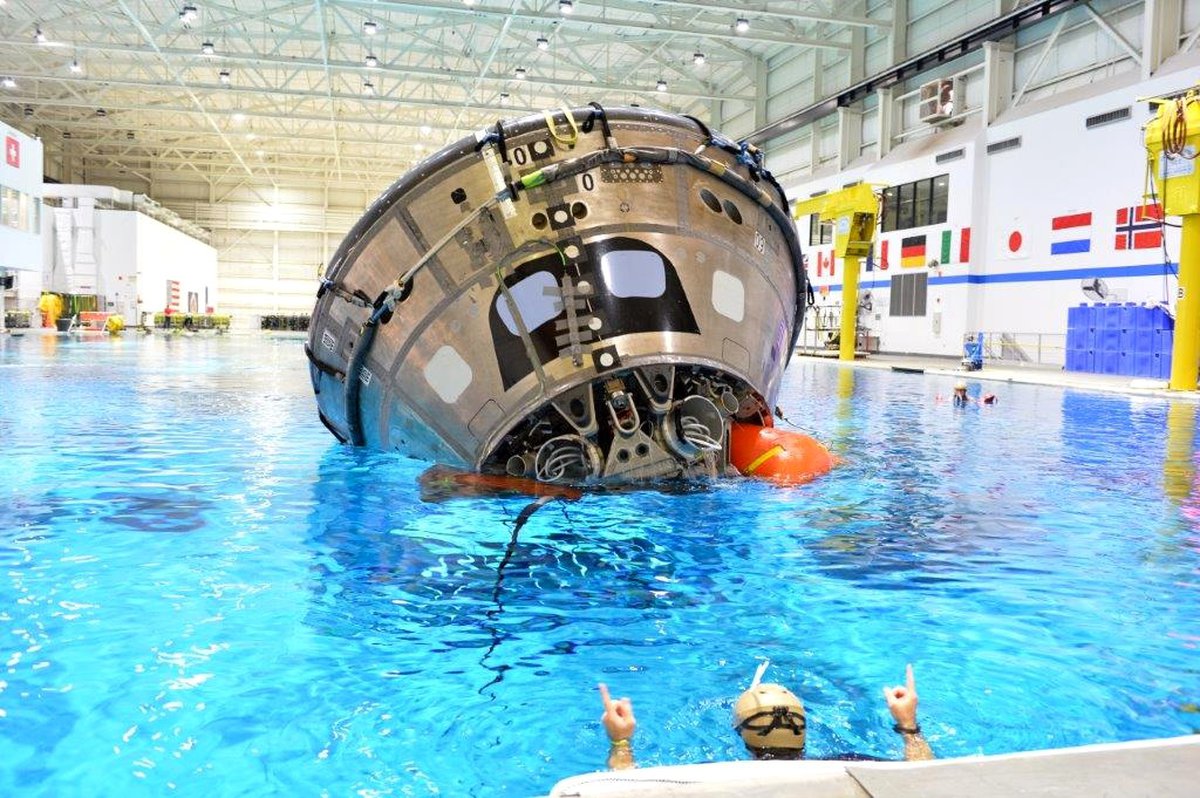 По соседству астронавты миссий «Артемида» тренируются покидать спускаемые капсулы в аварийных условиях — например, если капсула приводнится вверх ногами. Для таких тренировок используется макет капсулы в натуральную величину и большой бассейн.