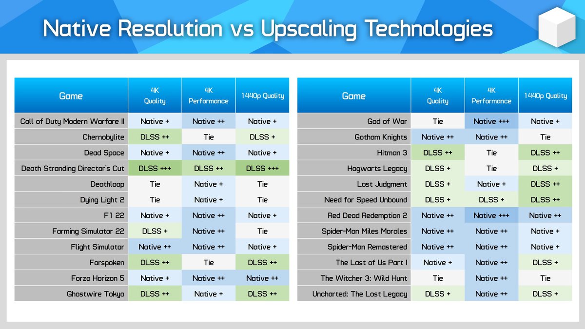 Оказалось, в некоторых случаях качество картинки с включенным апскейлом DLSS может быть даже выше качестве нативного рендеринга в том же разрешении. Журналисты протестировали 24 игры, в 11 из них картинка с DLSS хотя бы в одном разрешении превзошла по качеству нативный рендеринг.