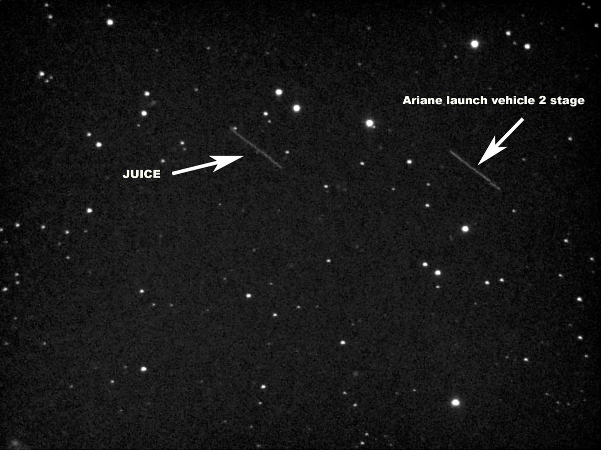 Нескольким астрономам и астрофотографам удалось заснять JUICE в полете. Например, вот так зонд и вторая ступень ракеты-носителя «Ариан» выглядят на кадре финского астронома Петри Куоссари.