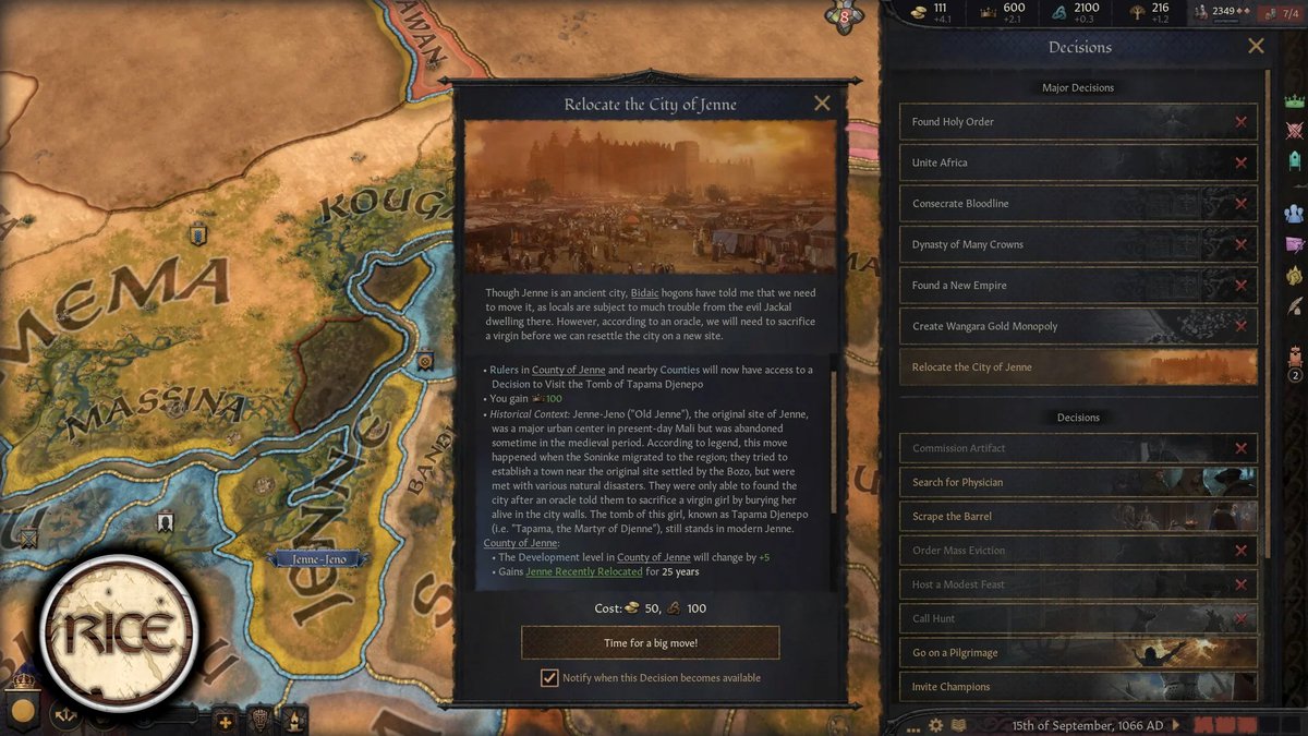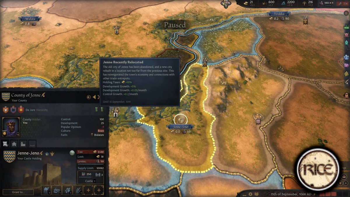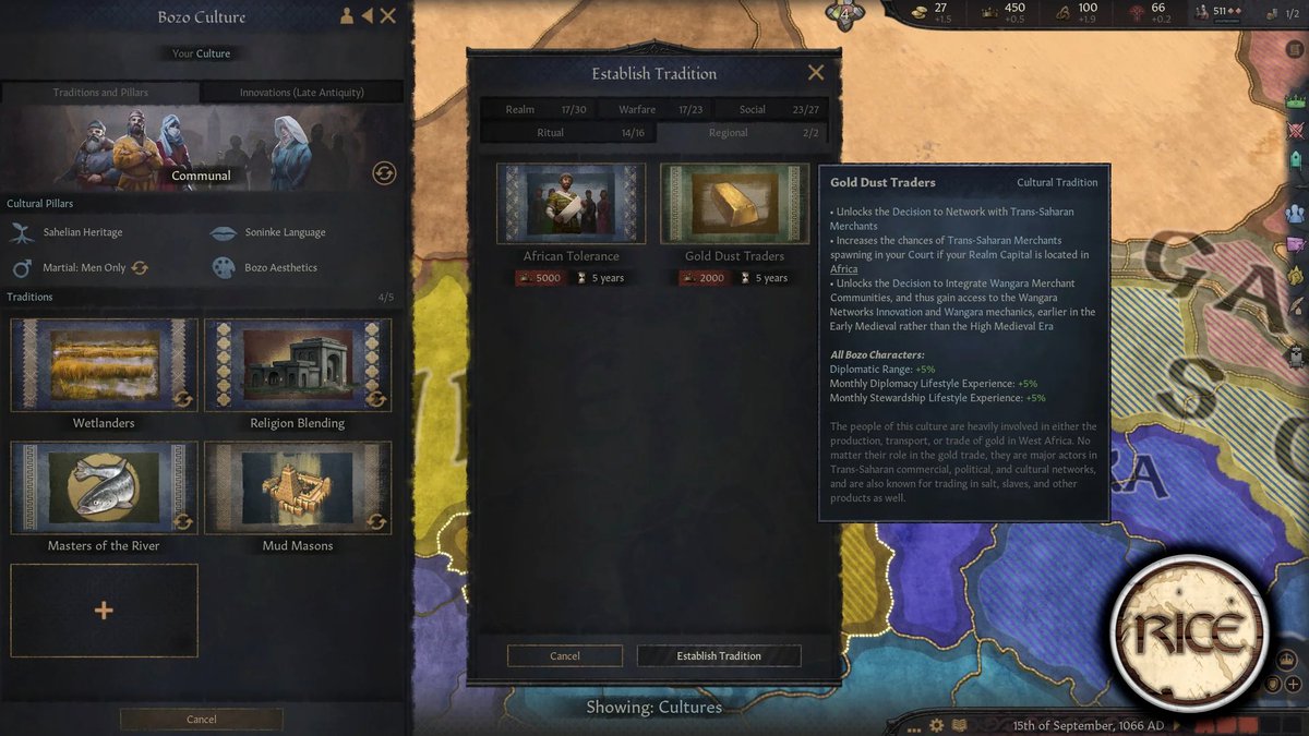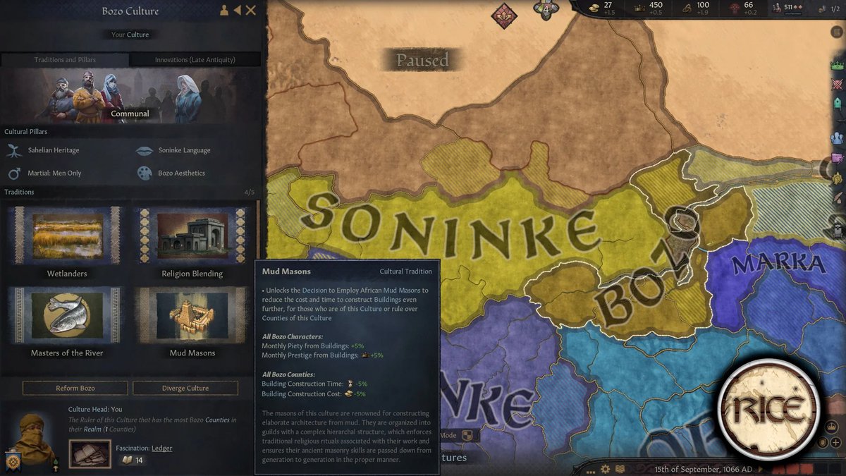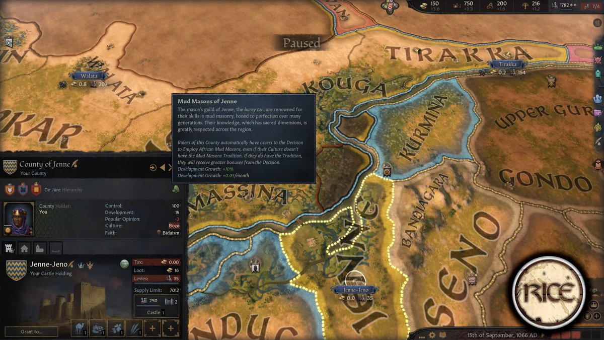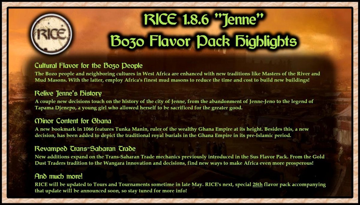 Regional Immersion and Cultural Enrichment - это мод для Crusader Kings 3, добавляющий в игру больше регионального колорита. И автор снова сделал контент для Африки, в этот раз для народа бозо, построенного им города Дженне, Империи Гана и некоторые улучшения транссахарской торговли.