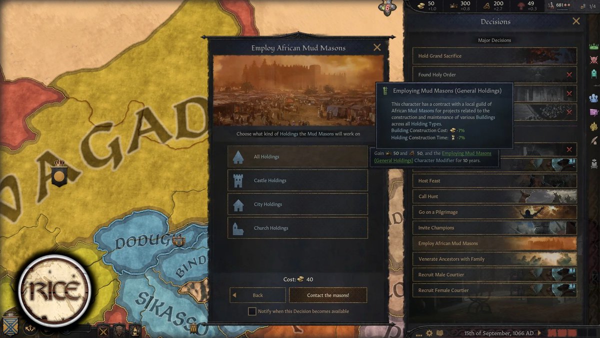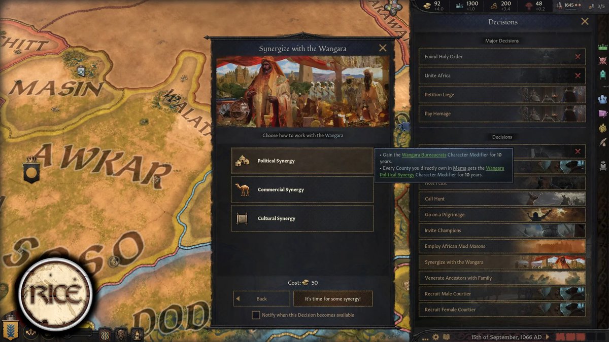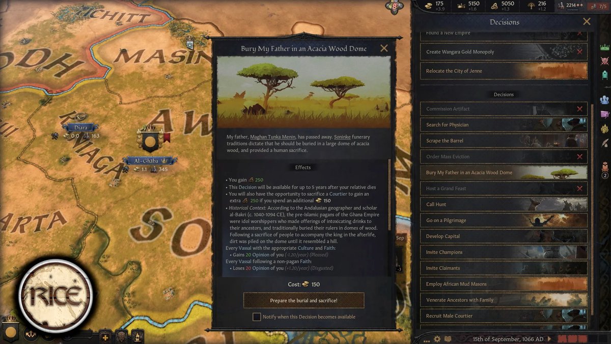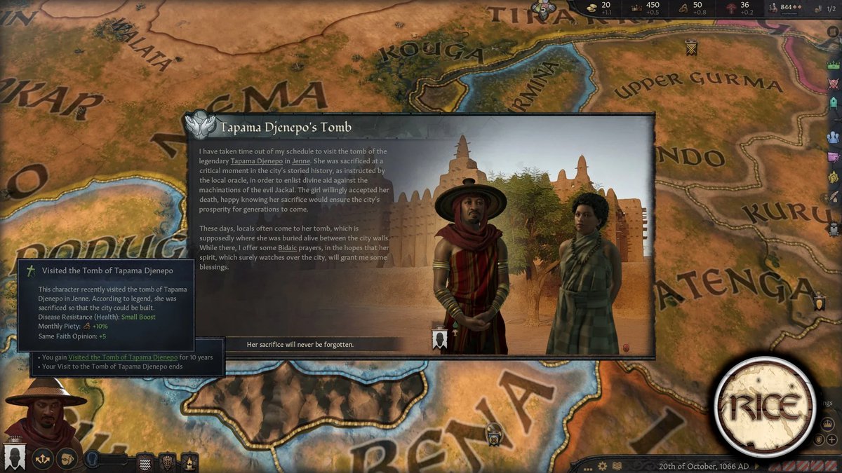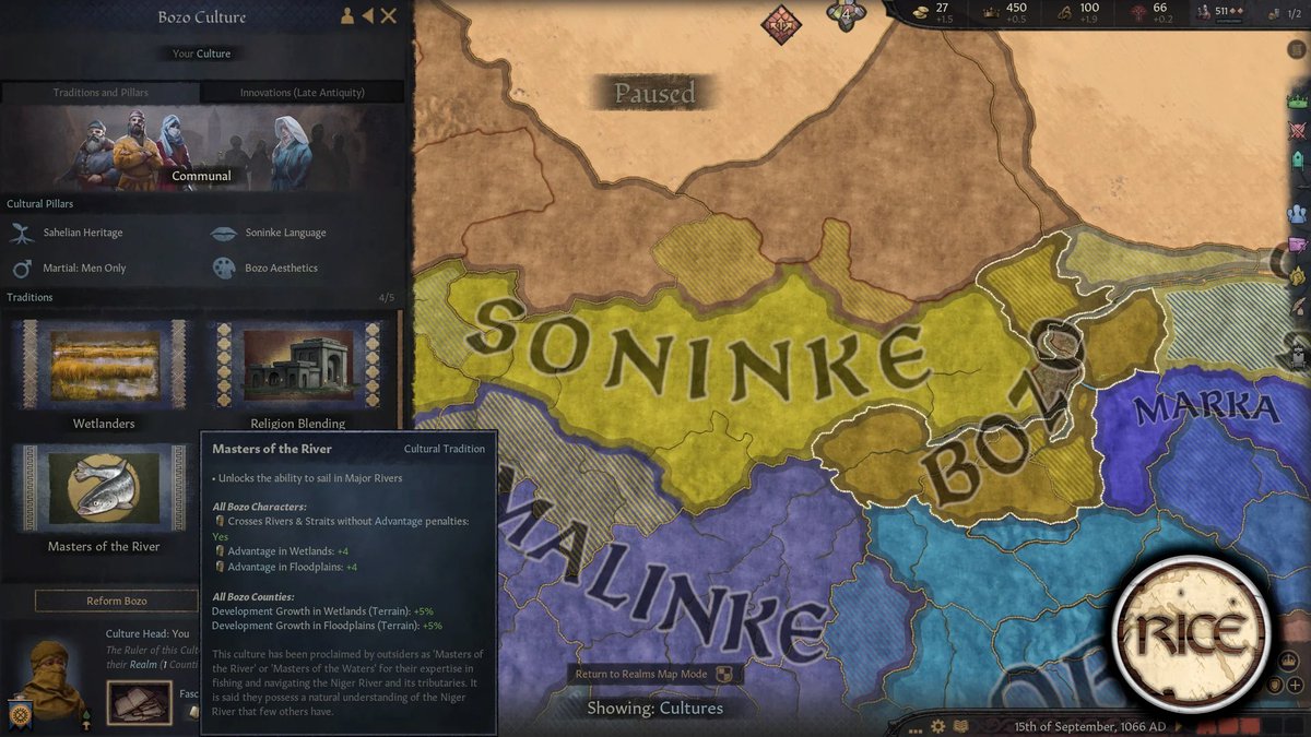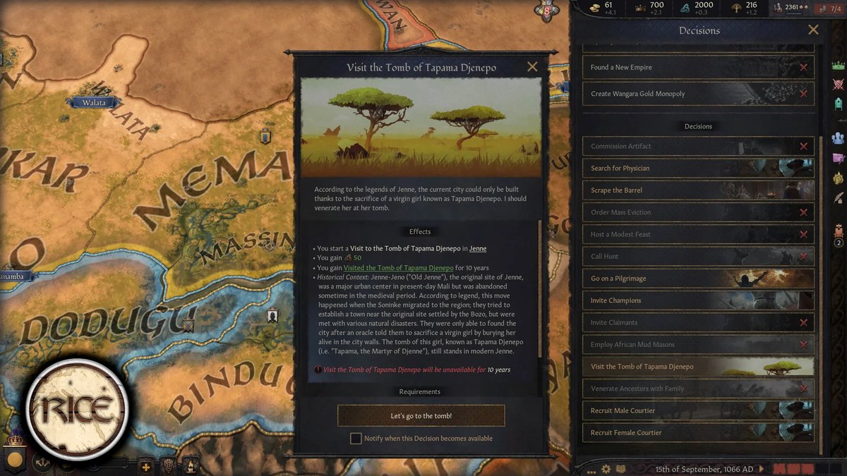 Regional Immersion and Cultural Enrichment - это мод для Crusader Kings 3, добавляющий в игру больше регионального колорита. И автор снова сделал контент для Африки, в этот раз для народа бозо, построенного им города Дженне, Империи Гана и некоторые улучшения транссахарской торговли.