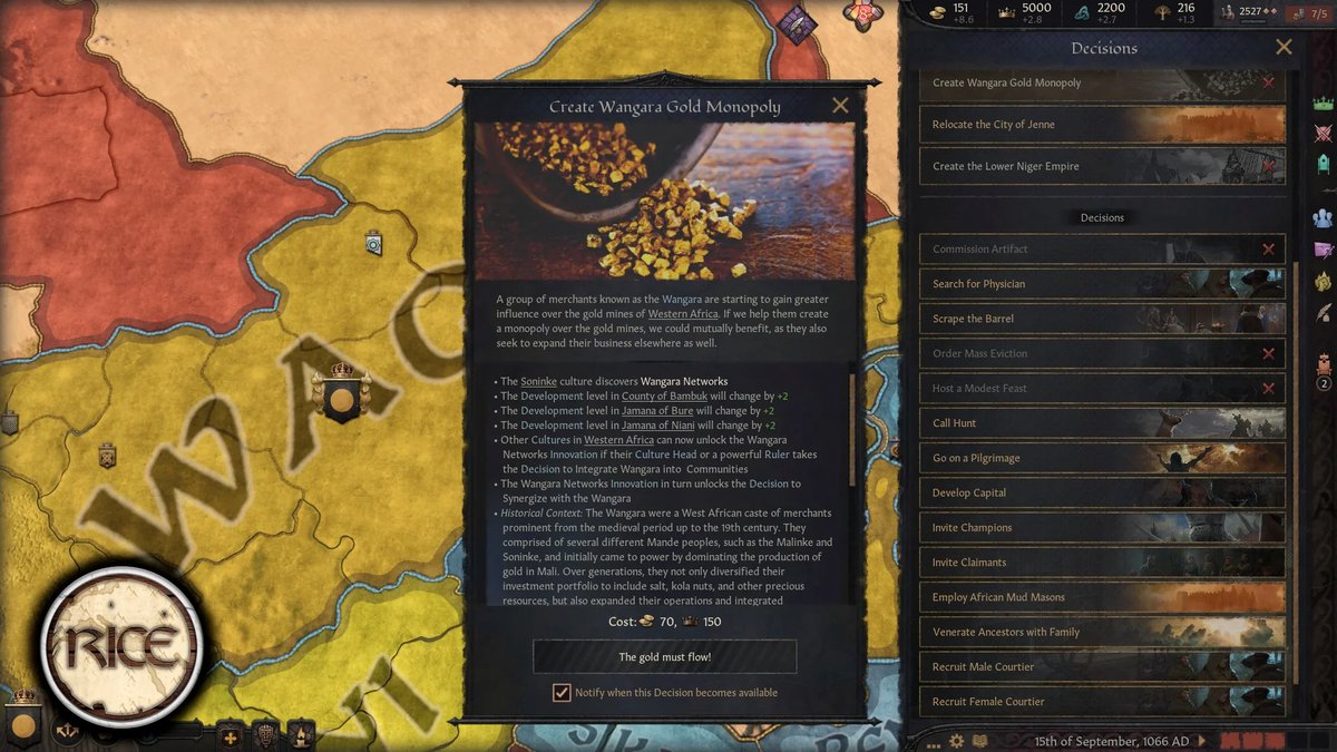 В источниках сказано, что вангара контролировали золотые прииски Мали, создав монополию. Игрок сможет эту монополию им установить, чтобы повысить развитие в графствах с этими рудниками и открывает доступ к инновации "Сети вангара".