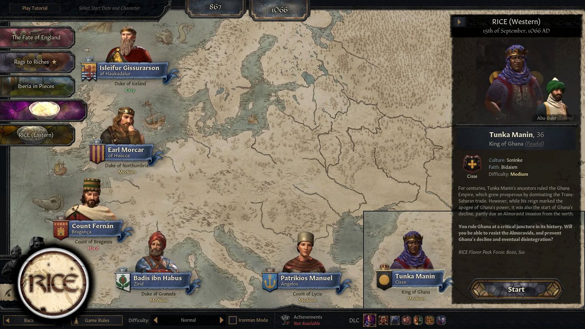 Новый стартовый персонаж - Тунка Манин. Она правила империей в 1066 году. В 1076 году на неё нападут представители берберской династии Альморавиды, а затем империя исторически развалилась. Может быть, вам удастся это изменить.