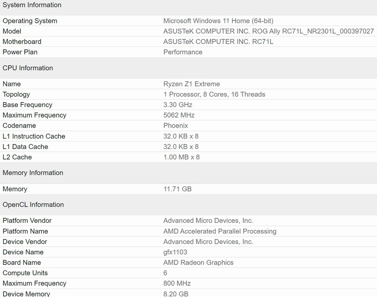 В базе бенчмарка Geekbench заметили характеристики портативной консоли ASUS ROG Ally. Во время тестирования устройство работало под управлением Windows 11 Home Edition.