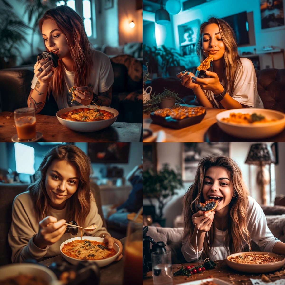 В комментариях энтузиасты быстро обнаружили, что если совместить в запросе геймпады и поедание спагетти, то получится нейросетевой джекпот. Midjourney явно не рекомендует есть и играть одновременно.