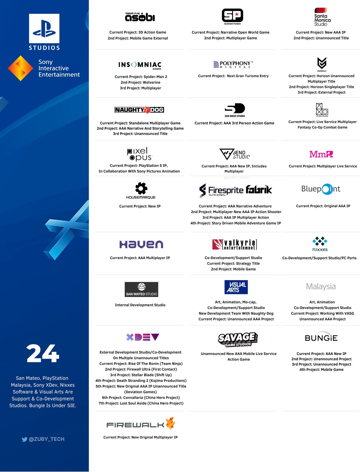 В конце апреля игровое подразделение Sony купило студию Firewalk, создающую неанонсированную игру-сервис. По этому поводу энтузиаст Zuby_Tech составил перечень всех студий, принадлежащих Sony, и их известных проектов.