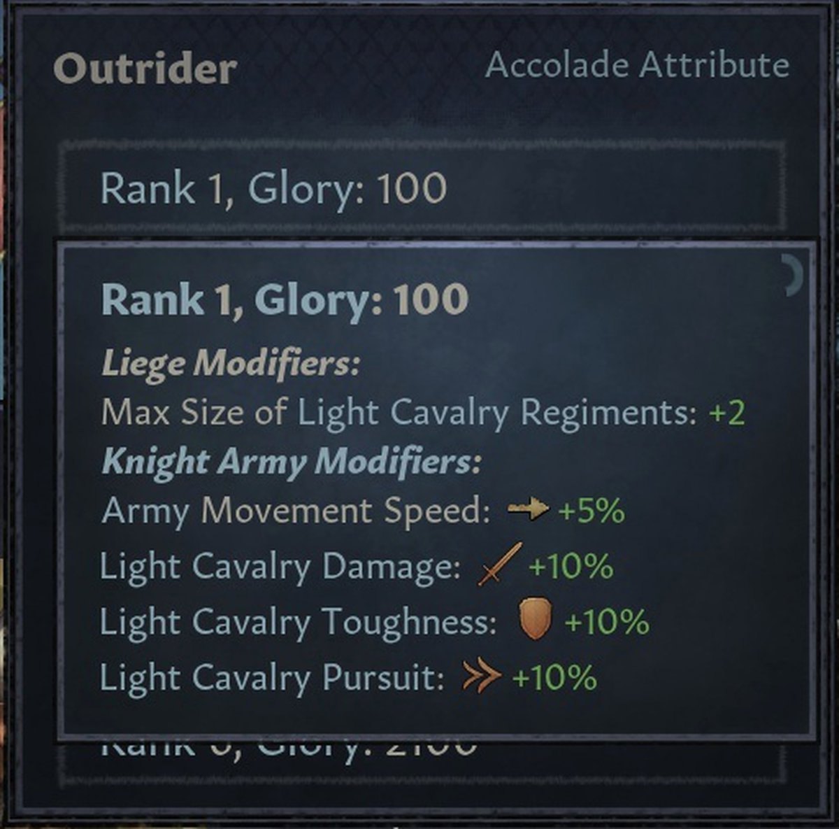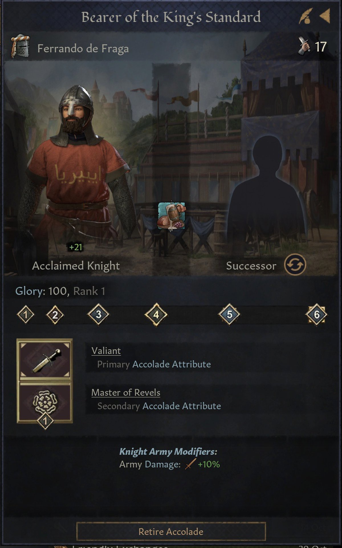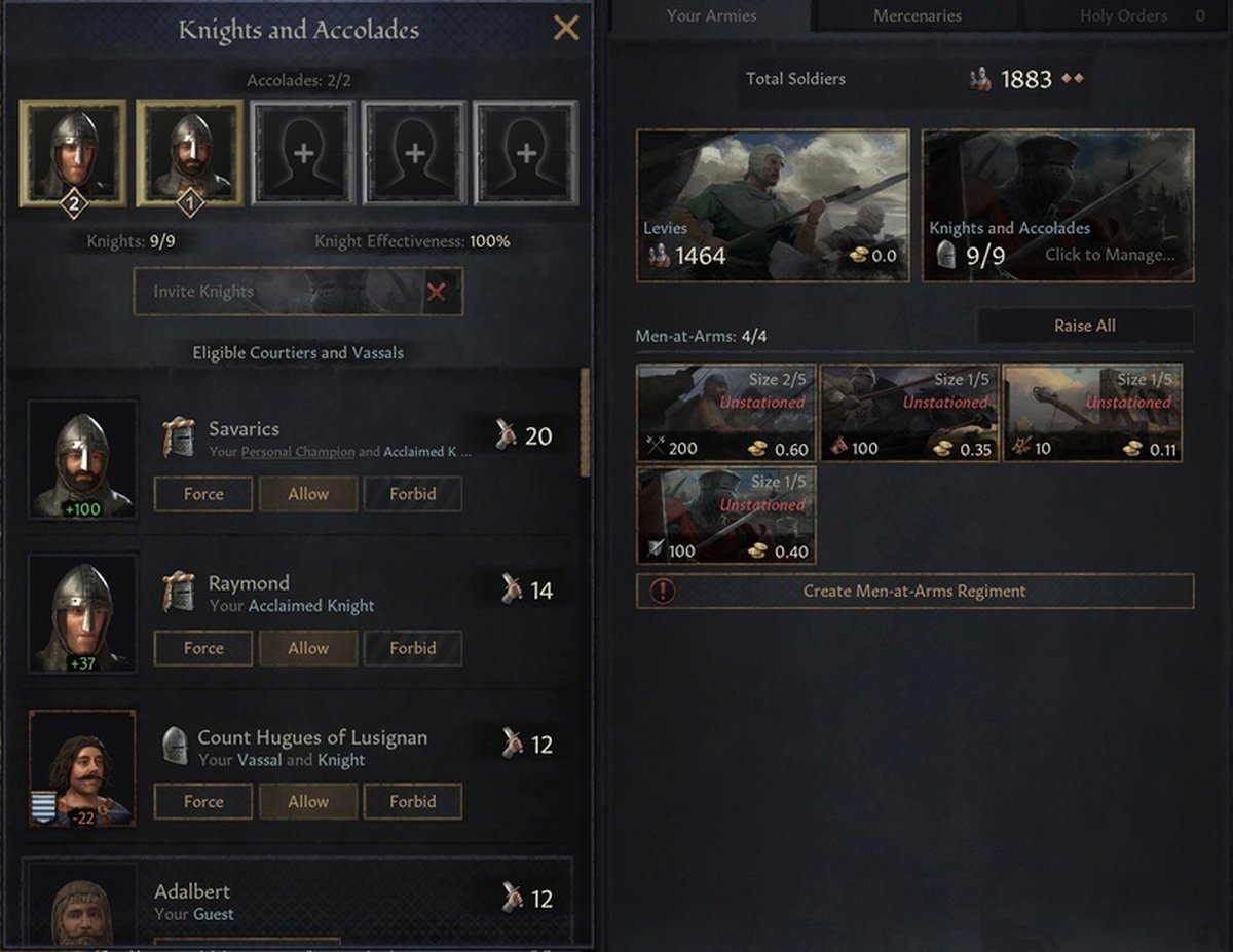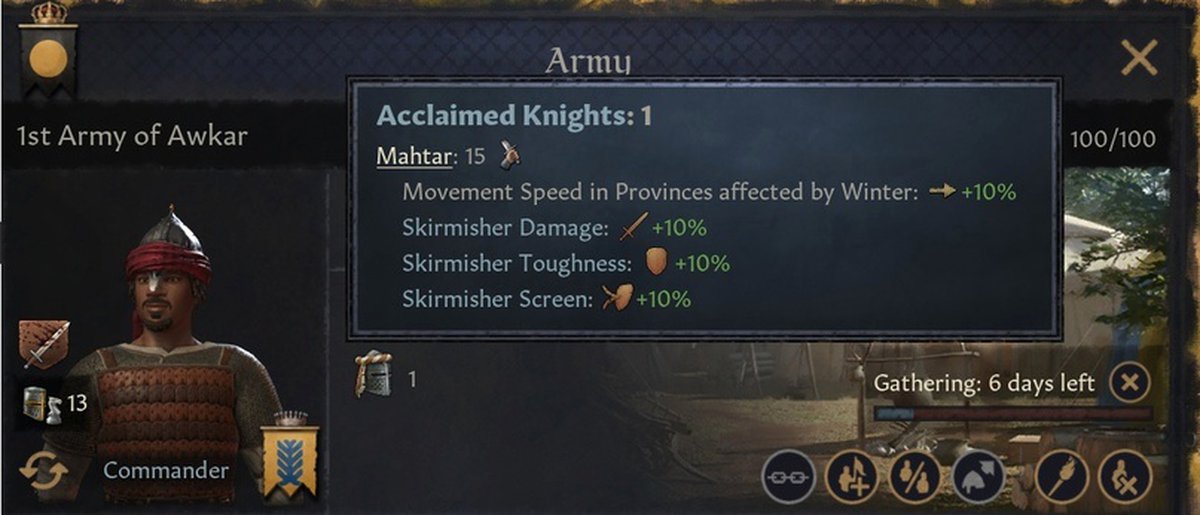 Как вы видели, бонусы акколад бывают военными. Но рыцарь не должен возглавлять армию, чтобы они работали. Достаточно в ней присутствовать ему.