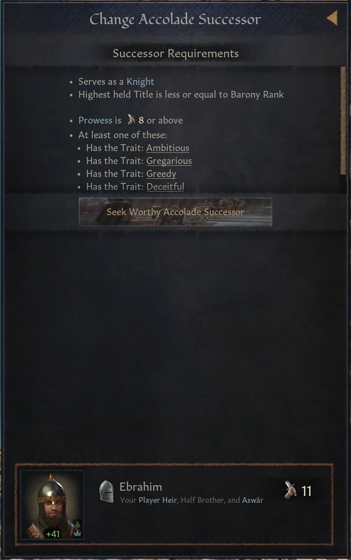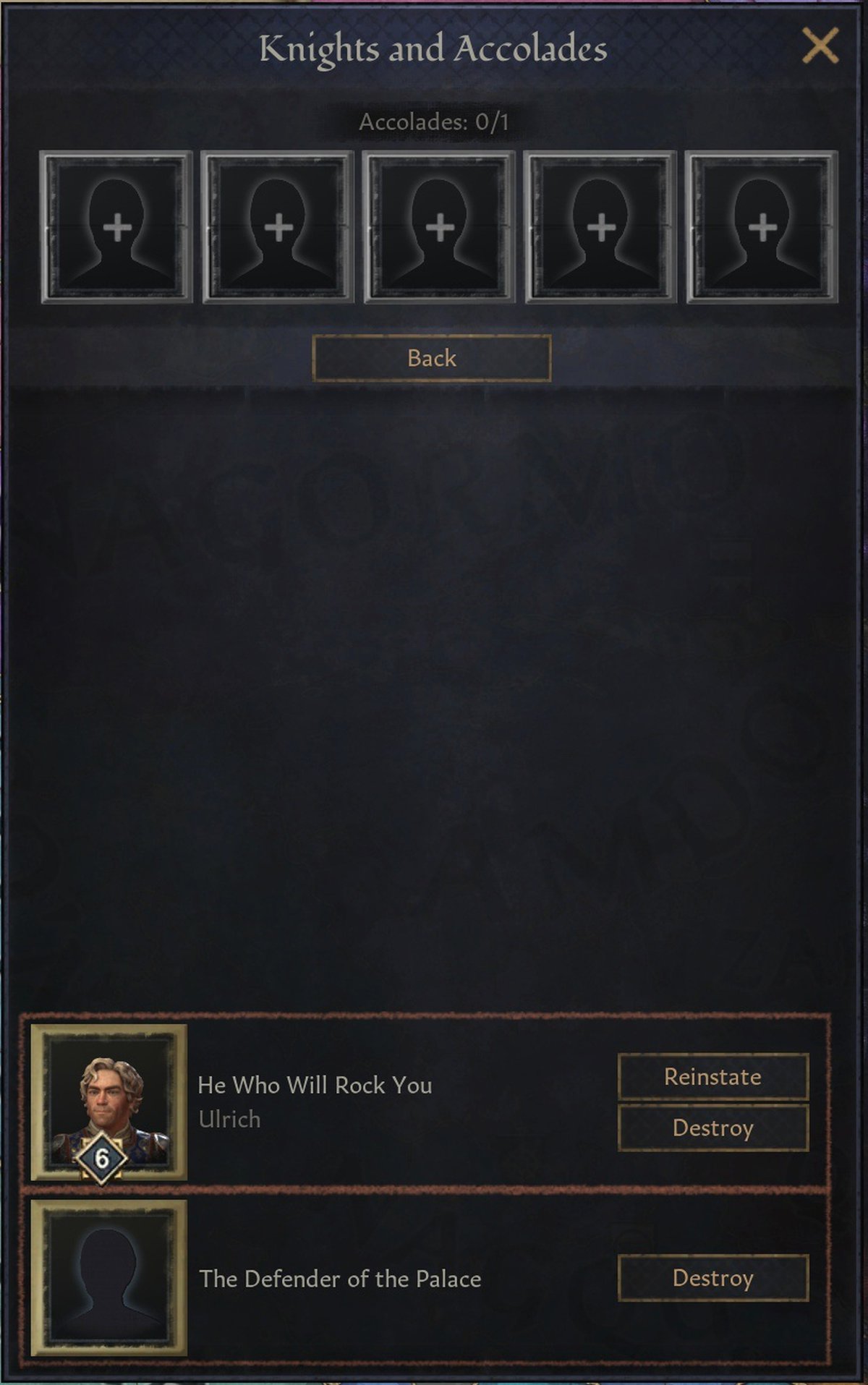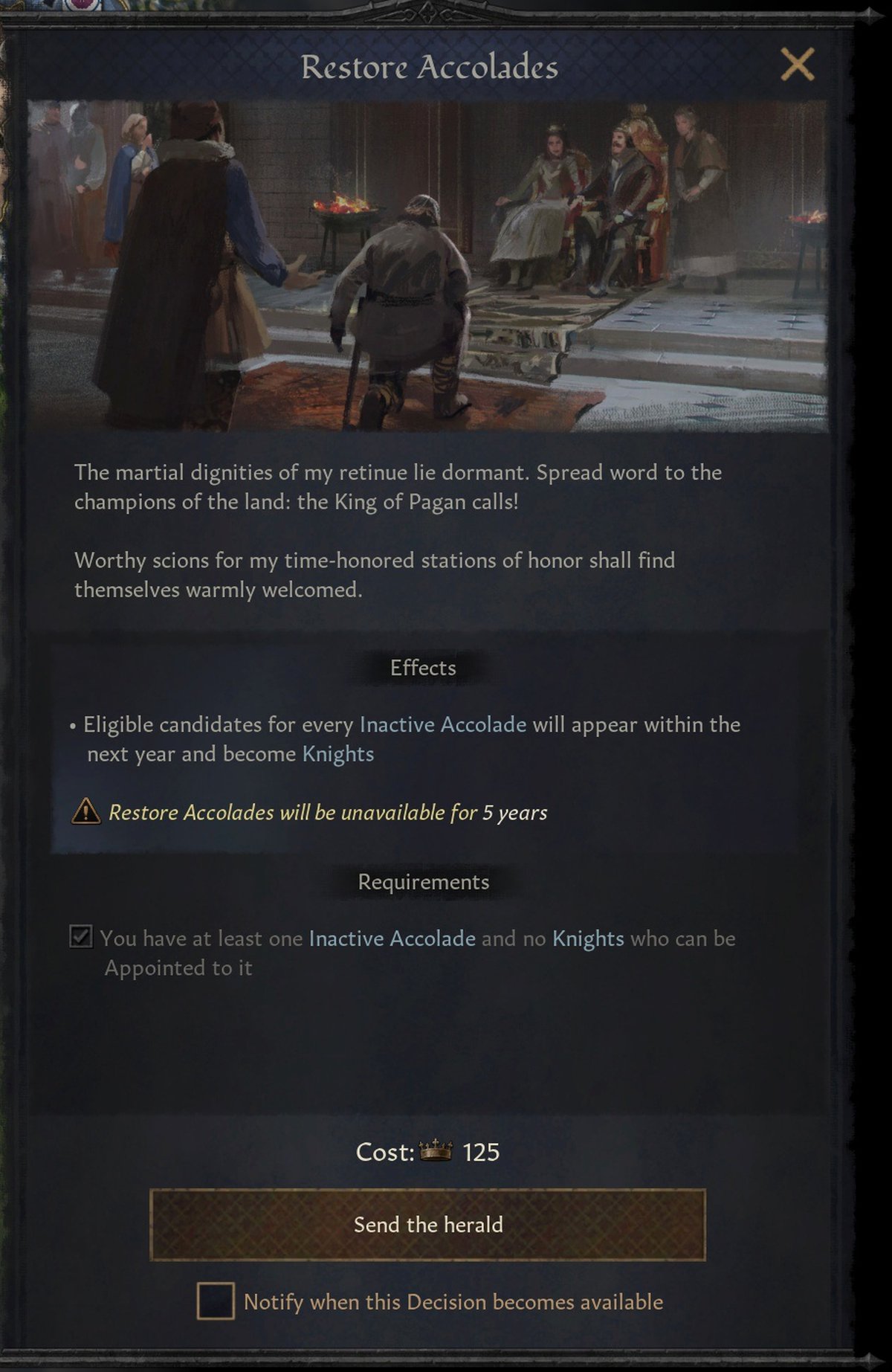 Если не хочется лазить по спискам персонажей при дворе и в государстве, можно просто принять специальное решение. Тогда игра сама найдёт подходящих рыцарей для акколад или сгенерирует новых.