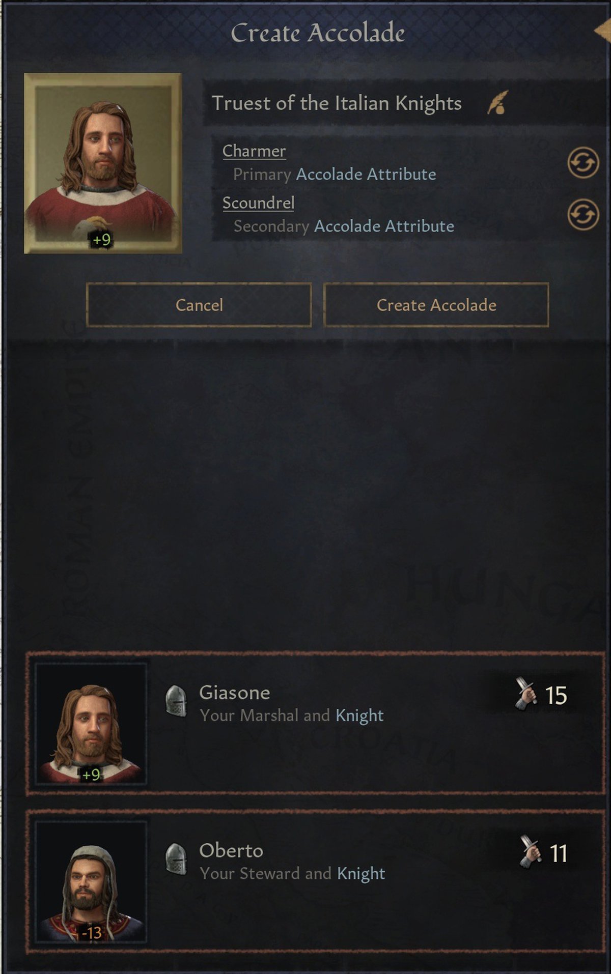 Атрибуты акколады отражают черты характера, навыки или другие качества рыцарей, которые выделяют их из толпы. От атрибута акколады будут зависеть бонусы.