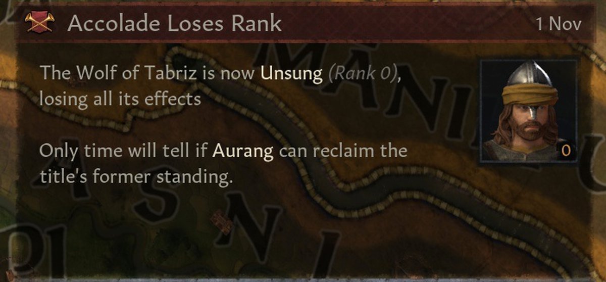 Слава не будет только накапливаться — иногда она теряется. Это происходит, когда рыцари проигрывают сражения, терпят поражения и передают акколаду по наследству.