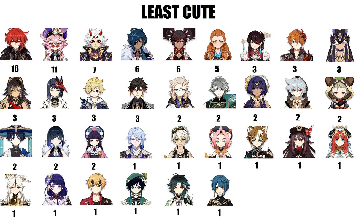 Одновременно фанаты попытались определить наименее милых героев. Здесь голоса распределились интереснее: лидеры все еще есть, но разница между ними и остальными персонажами не так велика.