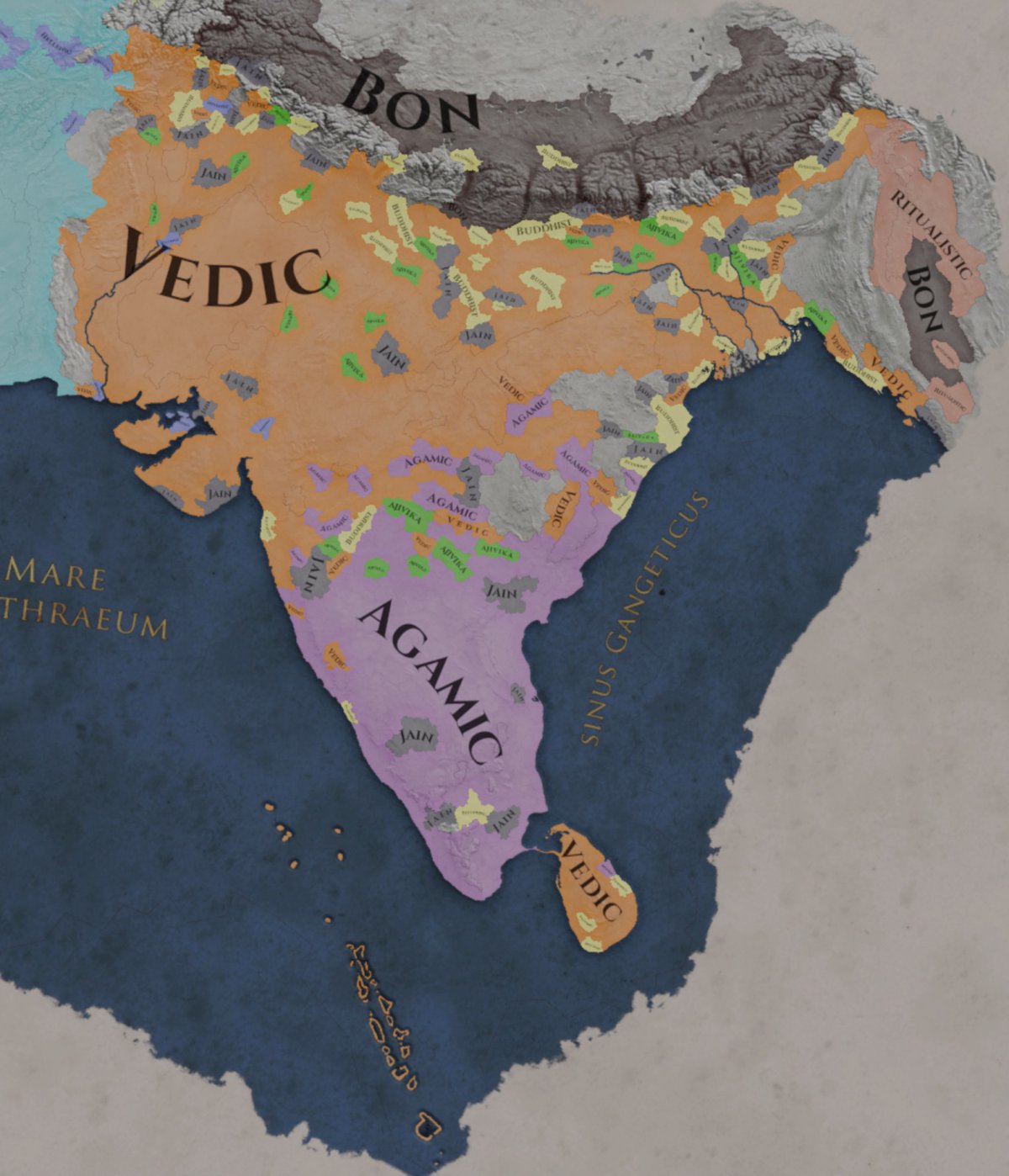 Здесь же в Индии добавили новые религии. Разработчики из Paradox в этом плане очень плохо отобразили полуостров. В ванильной игре был общий индуизм, моддеры же отделили ведические направления от агамы. Также добавили адживику - философско-аскетическое движение, предшествующее буддизму и джайнизму.