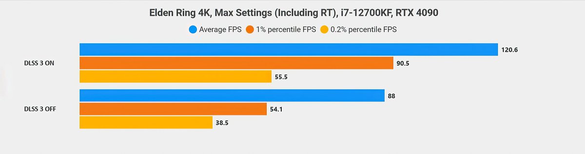 Использование DLSS 3 повысило частоту кадров в Elden Ring примерно в полтора раза. Судя по тесту WCCFTech, неофициальная поддержка DLSS 3 работает очень хорошо: журналистам не удалось заметить какие-либо артефакты генерации кадров.