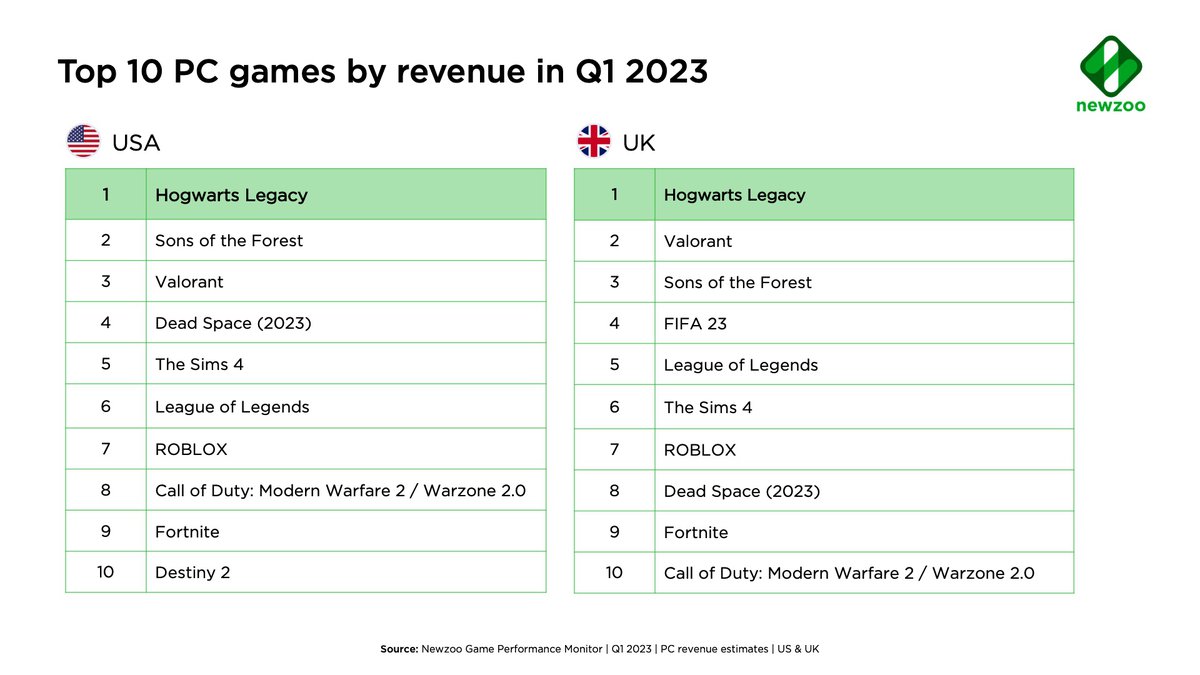 Аналитическая компания Newzoo опубликовала отчет о продажах PC-игр в первом квартале 2023 года. Данные собраны только по рынкам США и Великобритании, в обеих странах один и тот же лидер: Hogwarts Legacy.