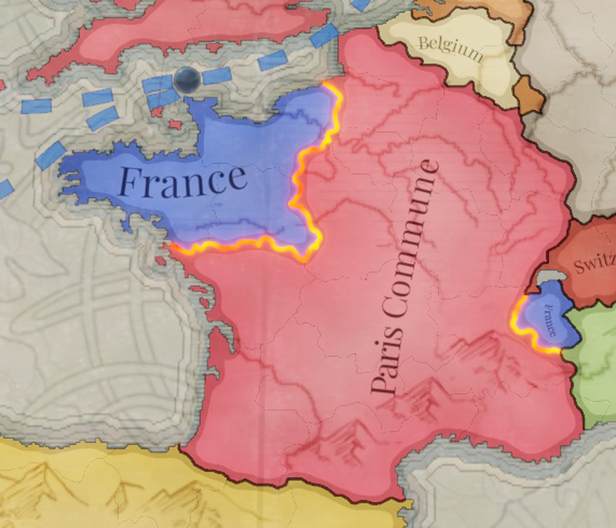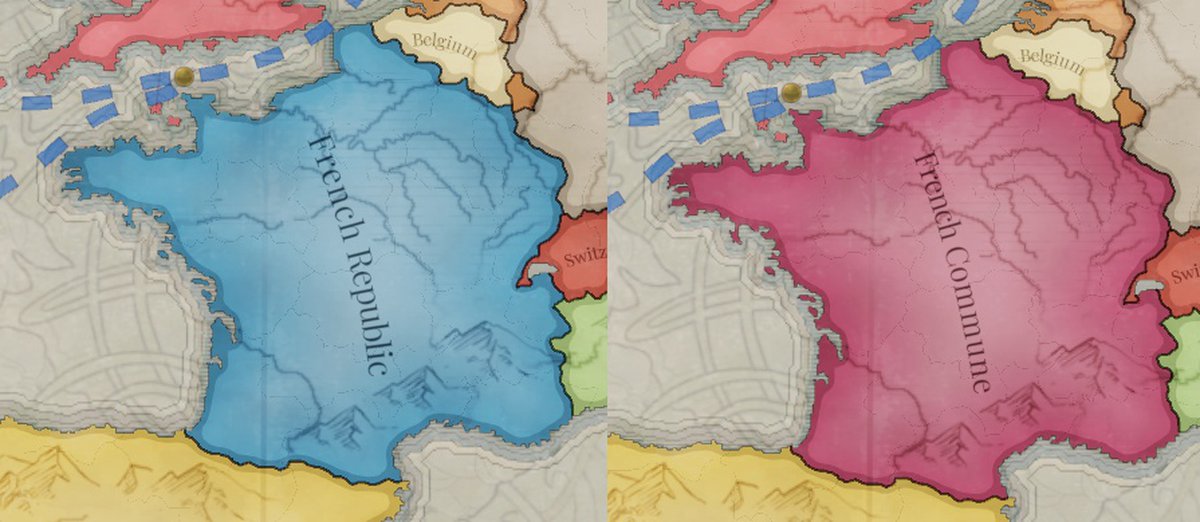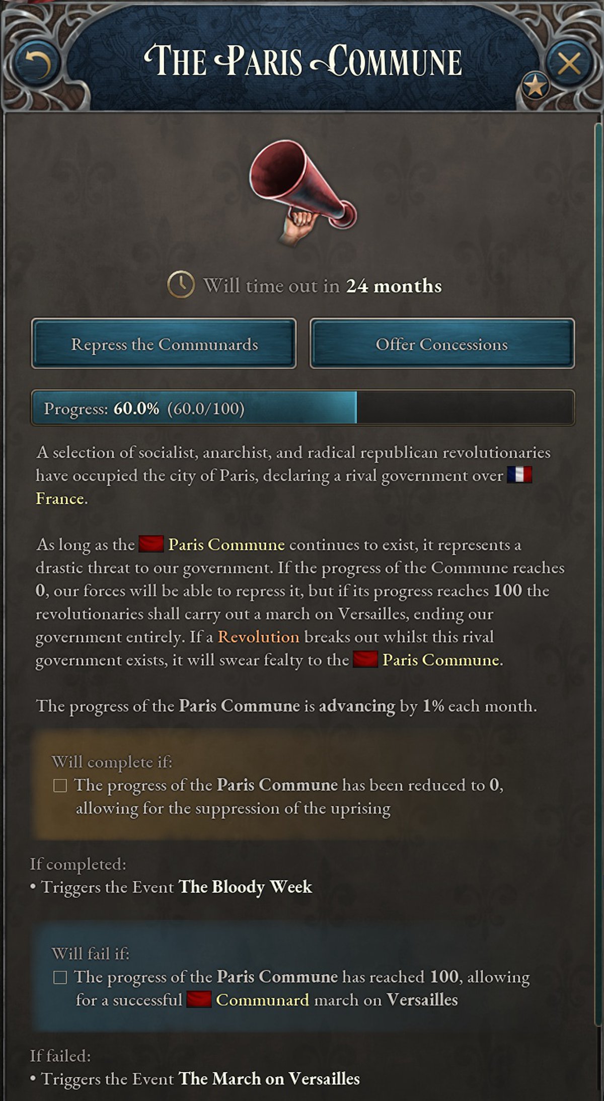 Если Парижская коммуна выстоит до революции во всей стране, но шкала не заполнится достаточно, чтобы провести неоспоримый марш на Версаль, то случится раскол. Станет две как бы Франции, игрок сможет выбрать, за какую ему дальше играть. Коммуна отвергает консерватизм прежнего государства и, родившись в революции, попытается проложить себе новый путь в беспокойном мире.