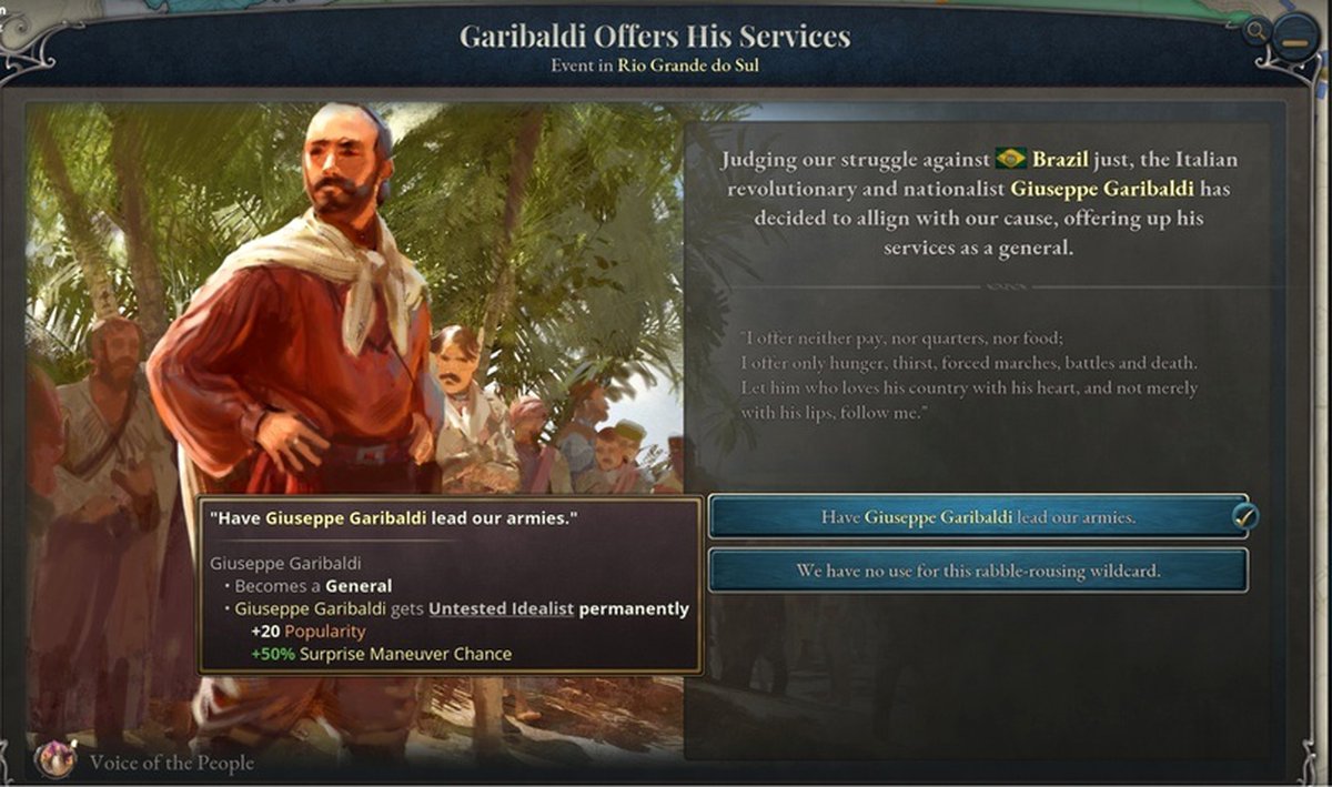 Странный момент, ранее писали, что хотя система агитаторов будет бесплатной, но с генерируемыми игрой персонажами. Мол хотите исторических, купите Voice of the People. А сейчас пишут, что объединитель Италии, Джузеппе Гарибальди, входит в 1.3.