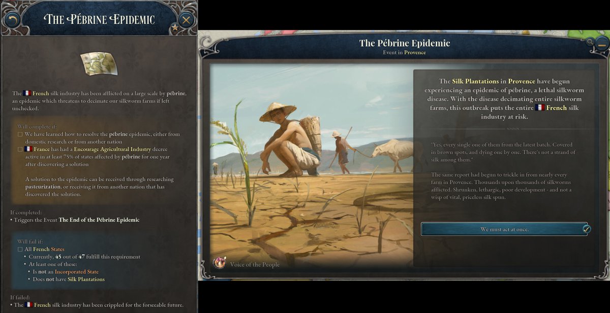 Но не только с политикой и технологиями можно столкнуться в новом контенте. Будет в дополнении и бедствие - эпидемия пебрины шелкопряда, которая бушевала с середины и до конца XIX века в Европе. Эта зараза распространяется через рынки, разрушает плантации шёлка и создаёт напряжение между внезапно уволенными работниками и владельцами плантаций.