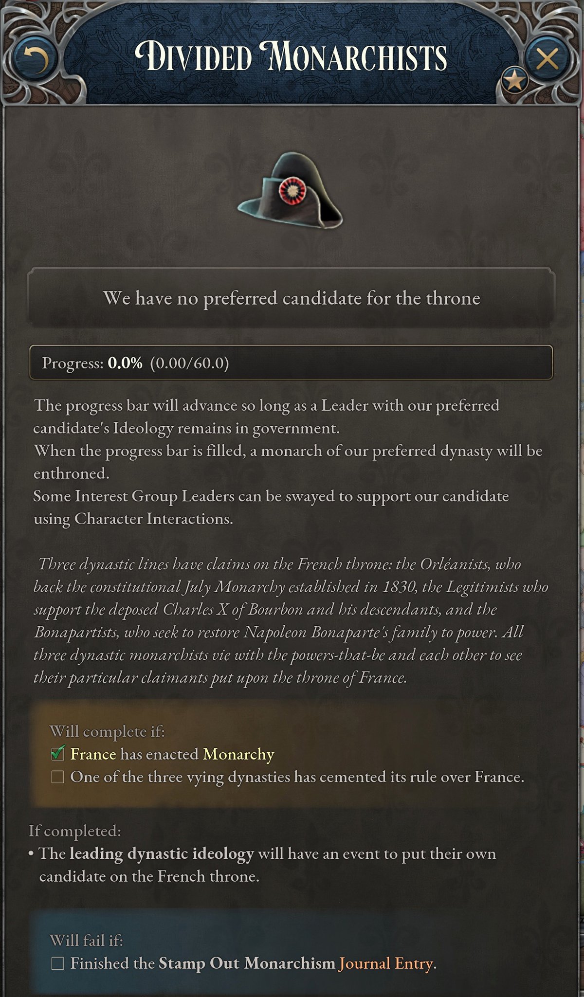 Орлеанисты в большинстве своём поддерживают умеренно-либеральную конституционную монархию, и именно их фракция находится у власти во Франции в 1836 году. Бурбонисты - консерваторы. Бонапартисты победили исторически, так в 1852г. Наполеон III стал императором, впрочем, до Франко-прусской войны.
