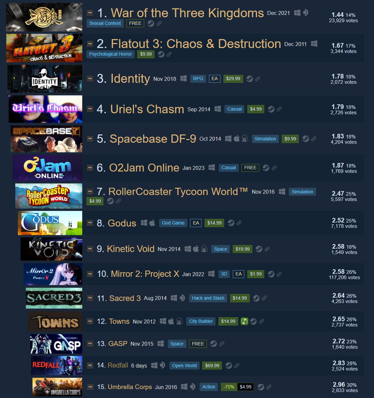 Соседями проекта Arkane Studios оказались Umbrella Corps и GASP. Также в антирейтинг входят Godus и Sacred 3, первое место сейчас принадлежит War of the Three Kingdoms с крайне отрицательными отзывами.