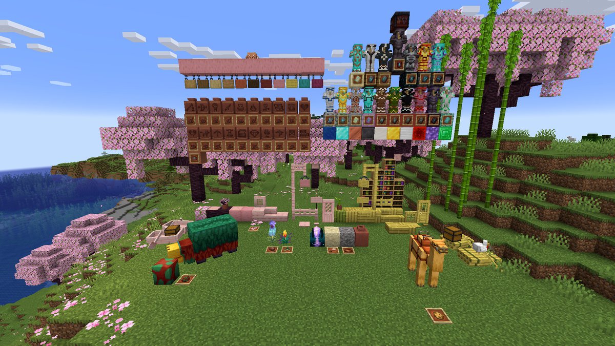 Деревья на фоне это часть нового биома, вишневой рощи. Коричневые горшки появятся в Minecraft вместе с системой археологии; также игроки получат мангровые блоки и подвесные таблички.