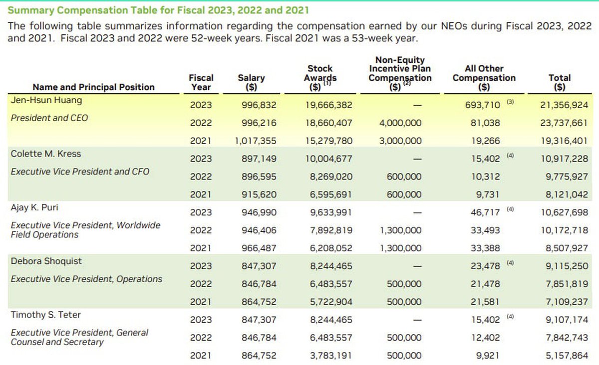 Корпорация Nvidia опубликовала данные о выплатах ключевым топ-менеджерам, включая основателя и руководителя компании Хуана Жэньсюня. Данные охватывают три финансовых года: 2021, 2022 и 2023.