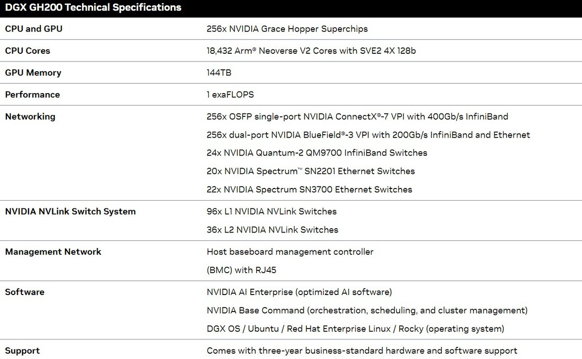 Правда, есть нюанс: суперкомпьютер Nvidia заточен на вычисления, связанные с искусственным интеллектом. В суперкомпьютере DGX GH200 используется 256 чипов Grace Hopper и 144 терабайт видеопамяти.