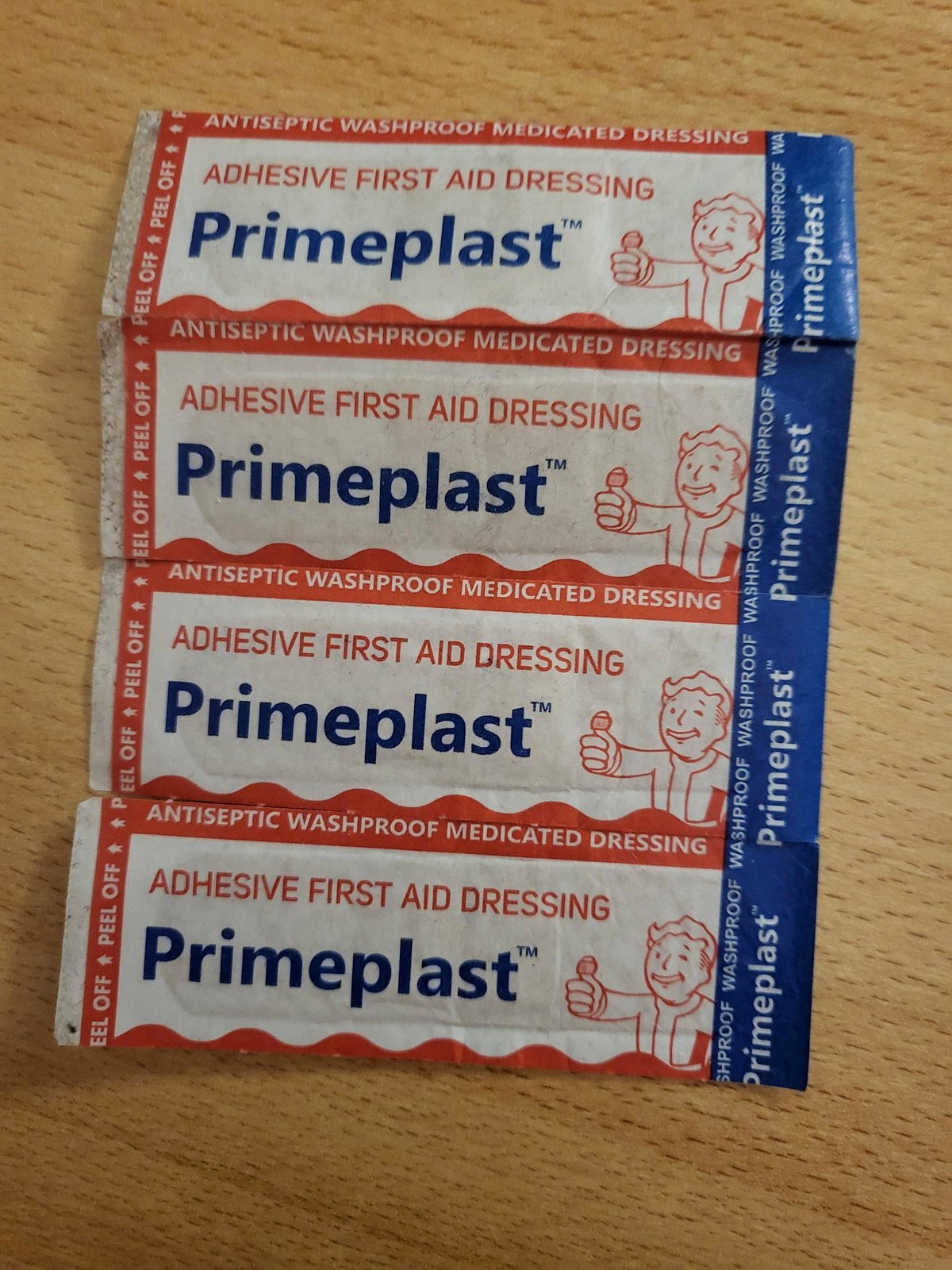 Производитель украсил упаковки пластырей Primeplast изображением Волт-Боя, маскота вселенной Fallout. Похоже, палец Волт-Боя, стоящего в характерной позе, замотан тем же самым пластырем.