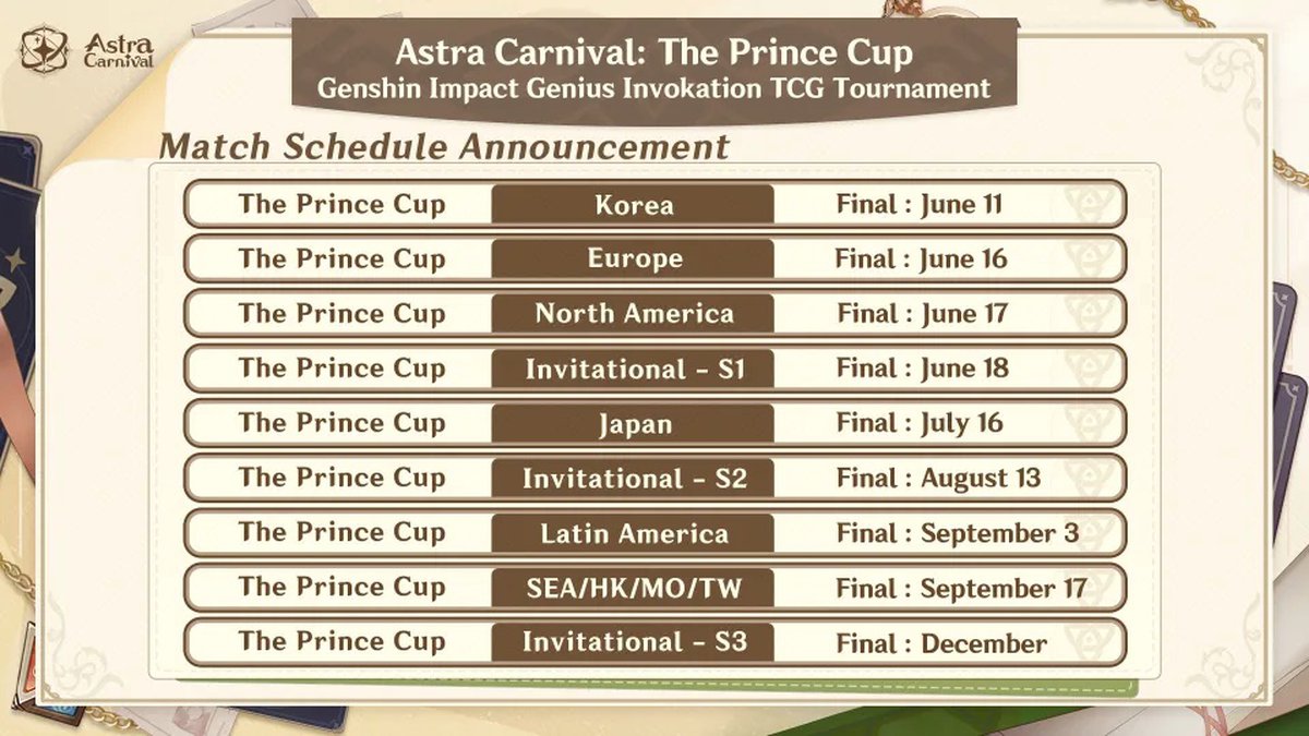 Разработчики Genshin Impact анонсировали Astra Carnival The Prince Cup, масштабный турнир по Священному призыву семерых, внутриигровой карточной игре. Турнир стартует в июне 2023 года и будет продолжаться до декабря.