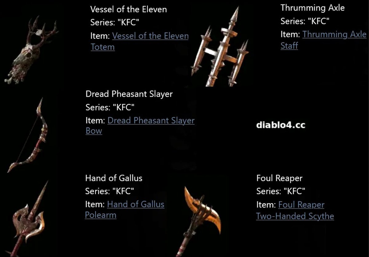 Скорее всего, речь идет о скинах, замеченных в дистрибутиве Diablo 4 в конце мая. Речь идет о скинах для лука, посоха, косы, тотема и копья, их дизайн и названия отсылают либо к курятине, либо к KFC.