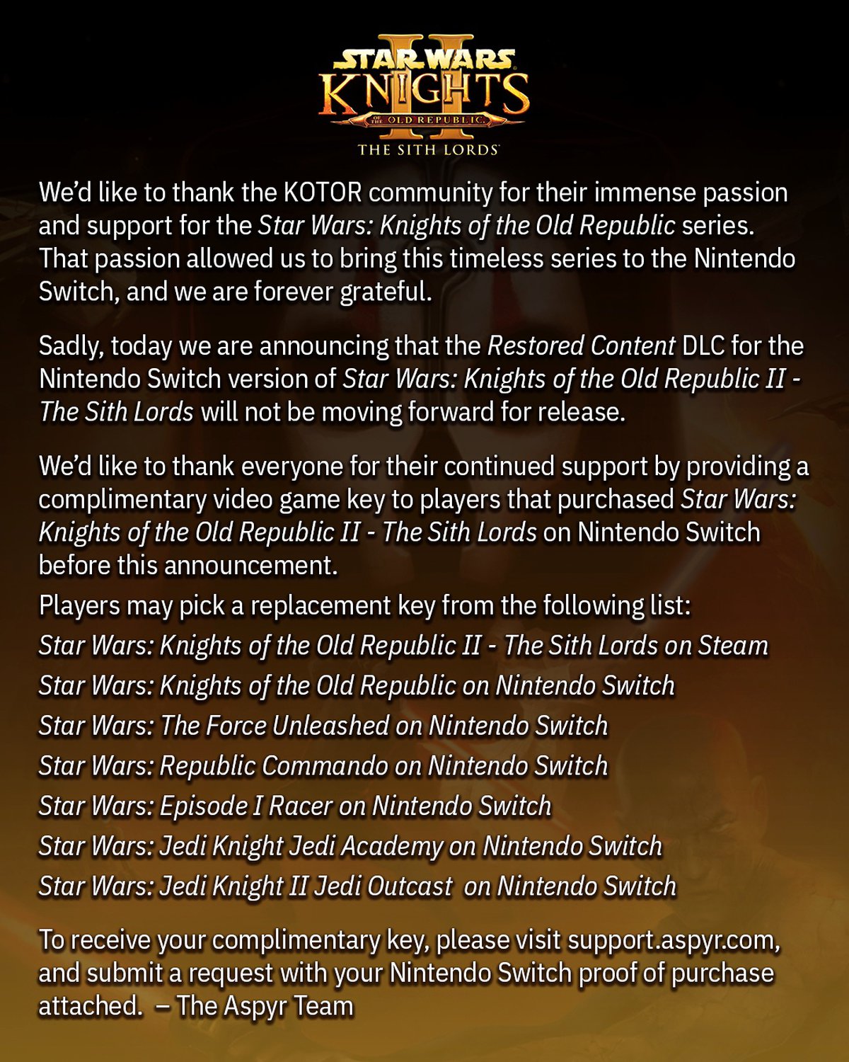 Чтобы получить подарок, игрокам необходимо связаться с техподдержкой Aspyr и предоставить доказательство покупки Star Wars Knights of the Old Republic 2 The Sith Lords для Nintendo Switch.
