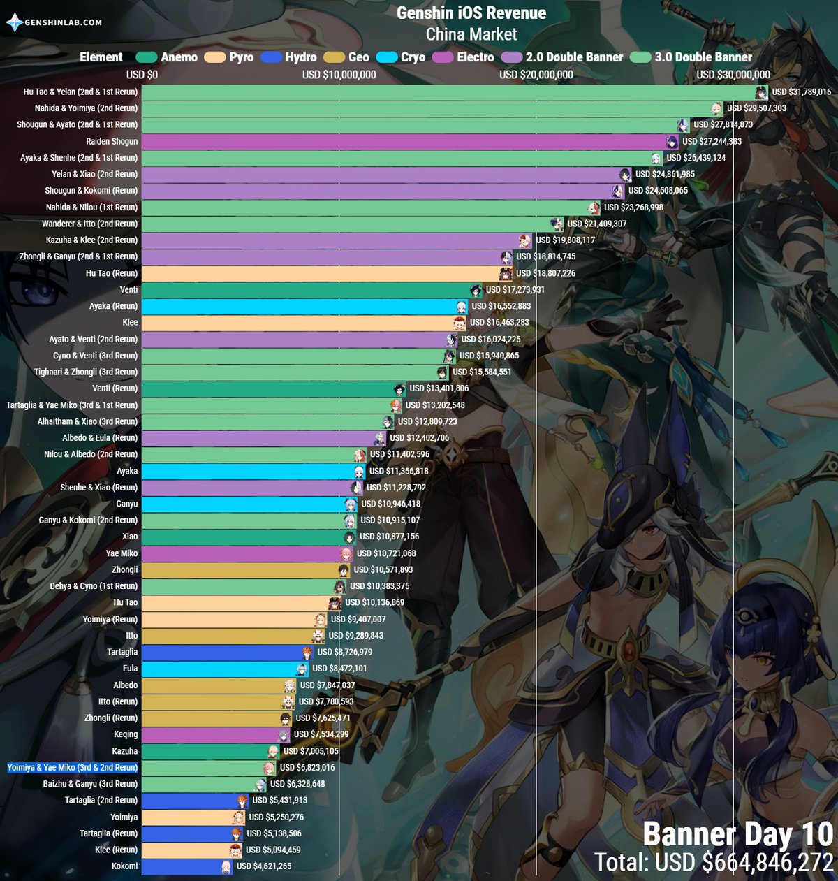 За первые десять дней баннер заработал $6.8 миллиона, следует из данных GenshinLab. Ресурс собирает информацию по выручке баннеров только на китайском рынке и только в версии Genshin Impact для iOS.