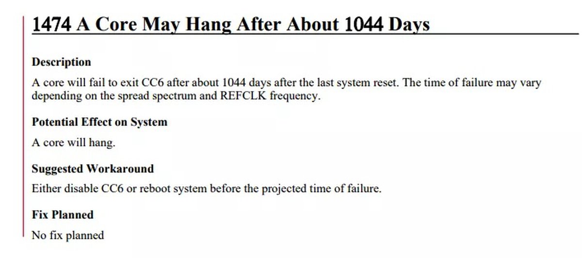Согласно руководству, процессор зависнет, потому что ядро не сможет выйти из состояния сна CC6. Компания рекомендует два решения: либо отключить CC6, либо перезагрузить процессор до того, как он отработает 1044 дня.