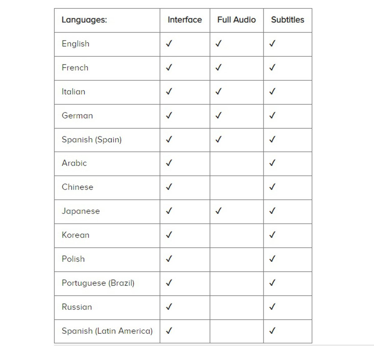 - Локализация субтитрами: арабский, китайский, корейский, польский, португальский, русский, латиноамериканский испанский.