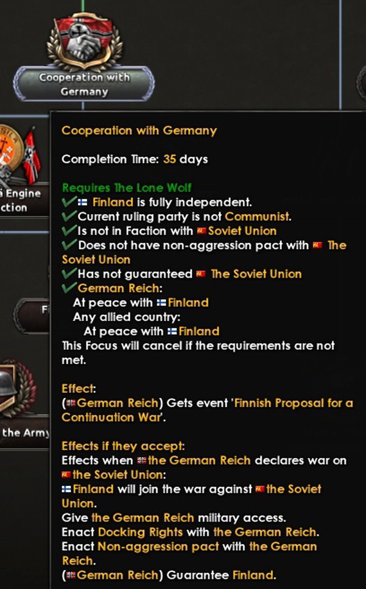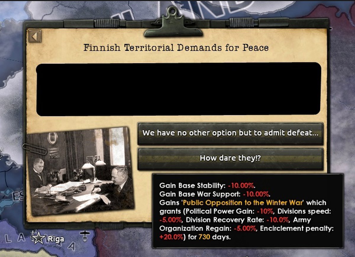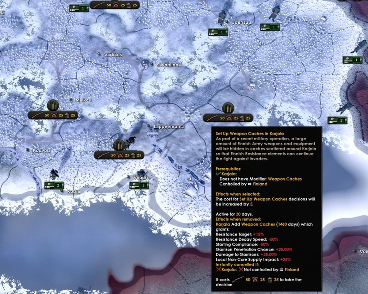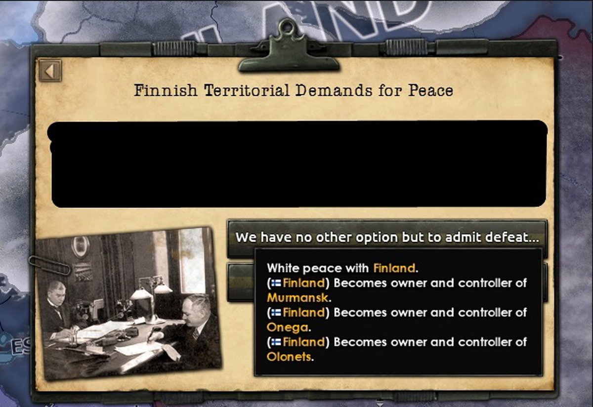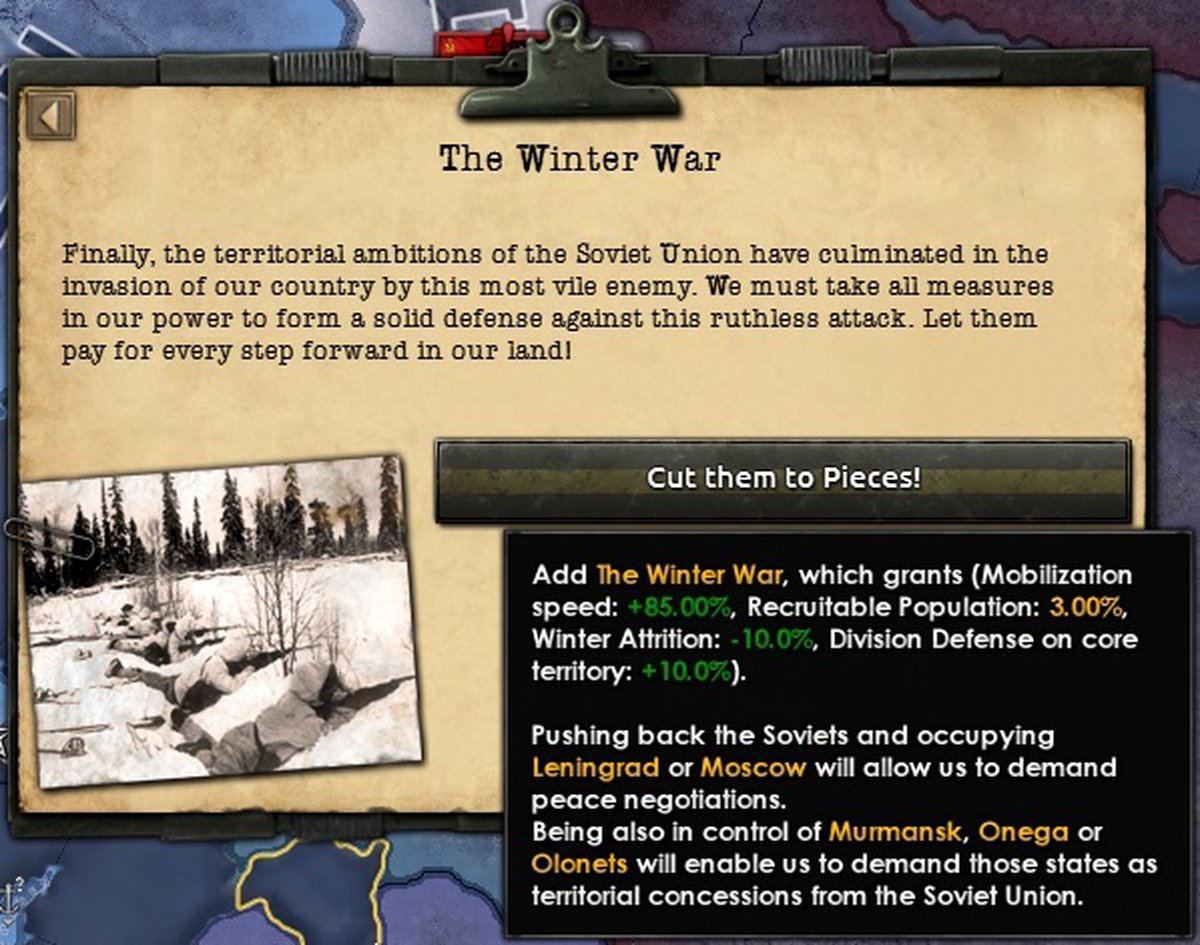 Это событие даёт Финляндии мощный национальный дух, помогающий стране противостоять мощи Советского Союза. Но, как видно на всплывающей подсказке, теперь у Финляндии есть способ выйти из войны, если она сможет откинуть советские войска назад.