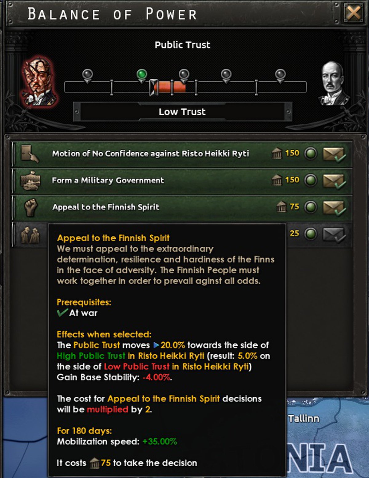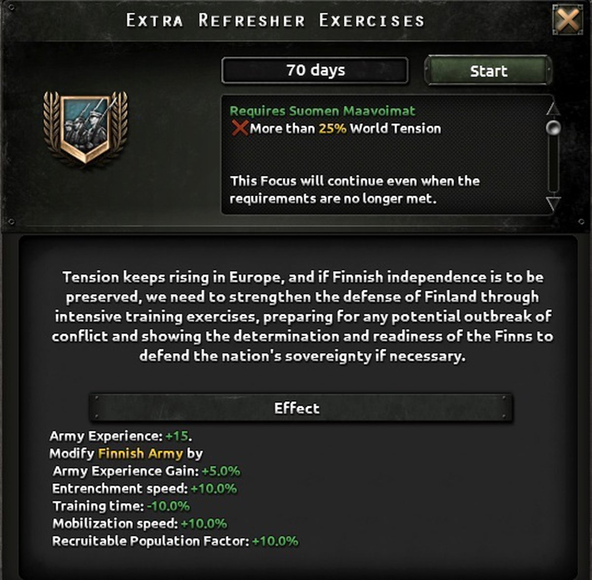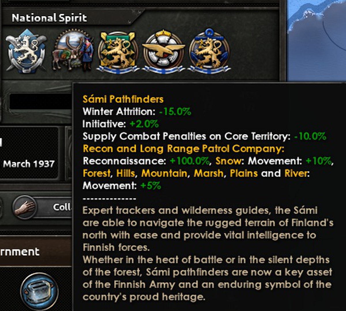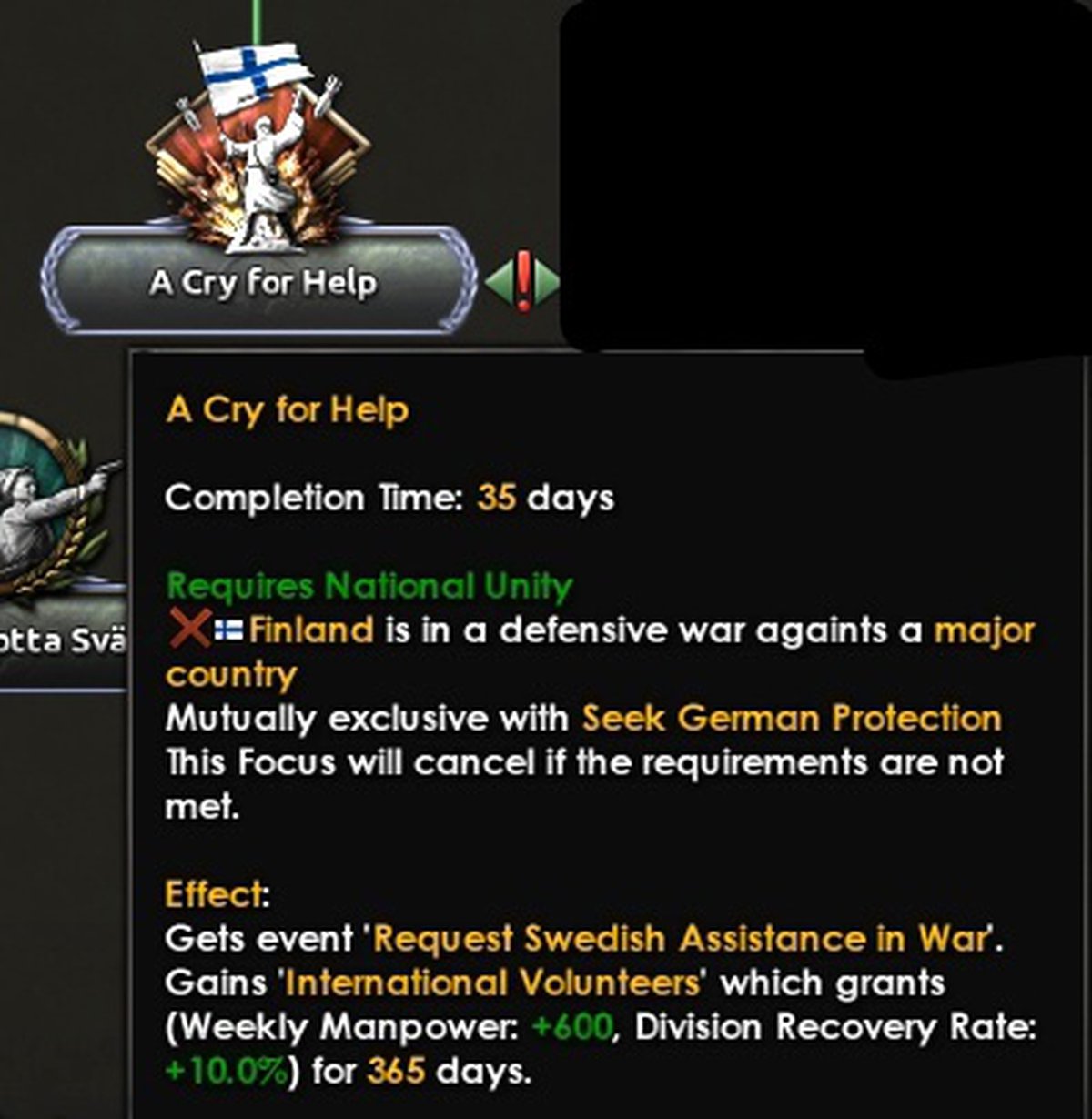 Это событие даёт Финляндии мощный национальный дух, помогающий стране противостоять мощи Советского Союза. Но, как видно на всплывающей подсказке, теперь у Финляндии есть способ выйти из войны, если она сможет откинуть советские войска назад.
