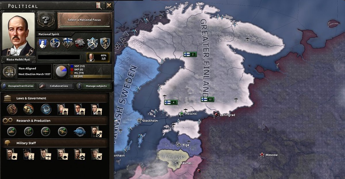 Помимо этого, будут происходить события, позволяющие менять лидеров. Те же выборы 1937 года позволят решить, переизбирать Свинхувуда или нет. Следующий лидер, Каллио, умрёт в конце 1940-го. Если Маннергейм станет президентом во время войны, то можно будет потом передать власть Паасикиви без лишних усилий. Хотя есть возможность Карла Густава и оставить.