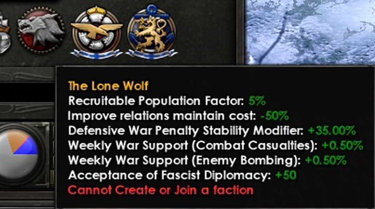 Середина и нижняя часть центральной подветки сфокусирована на внешней политике. Здесь можно присоединиться к союзникам, покуда демократические силы пользуются достаточной поддержкой, создать альянс «Фронт северной обороны» с другими скандинавскими и прибалтийскими странами, или действовать по-своему и стать волком-одиночкой. Если следовать истории, надо стать волком.