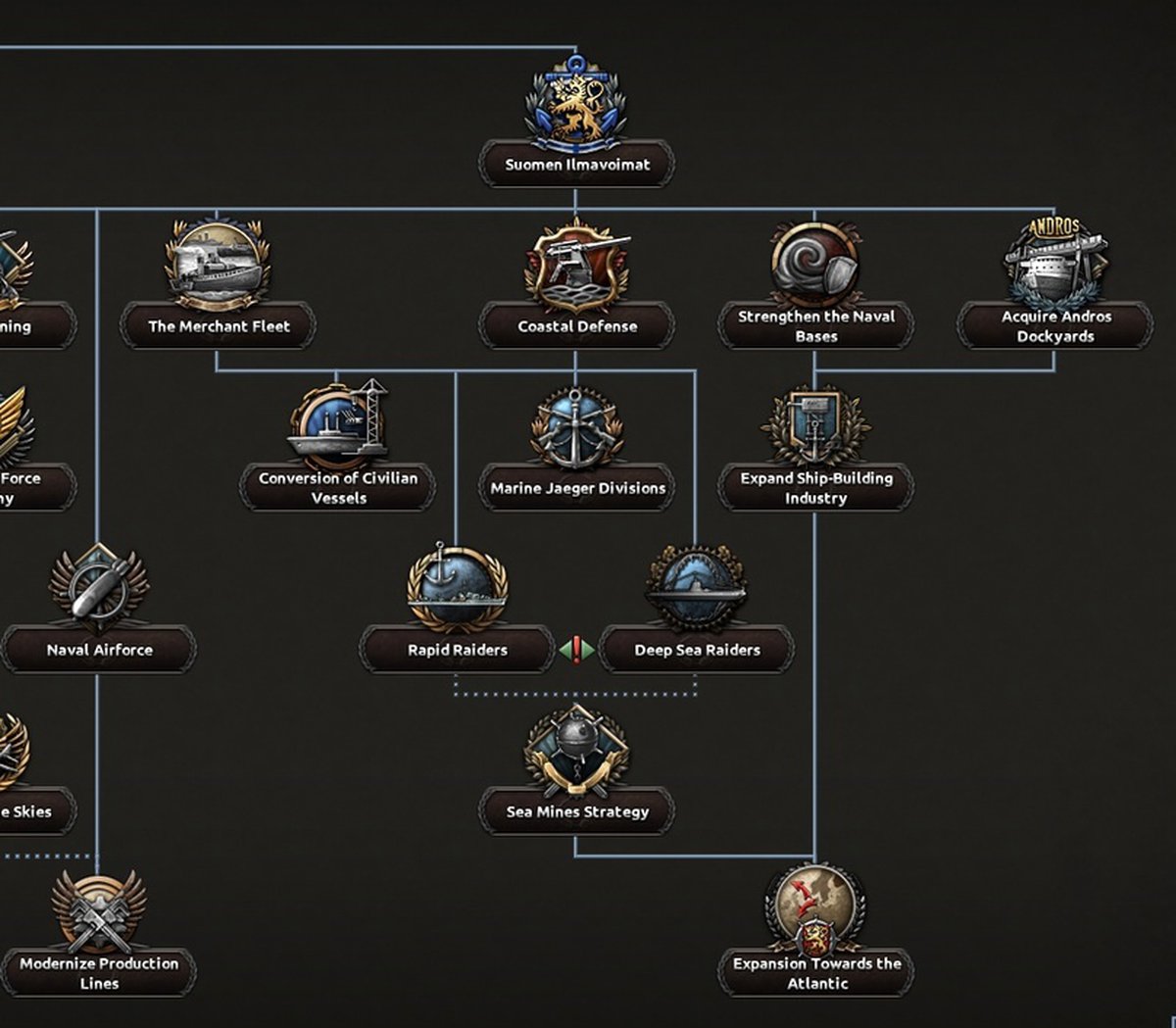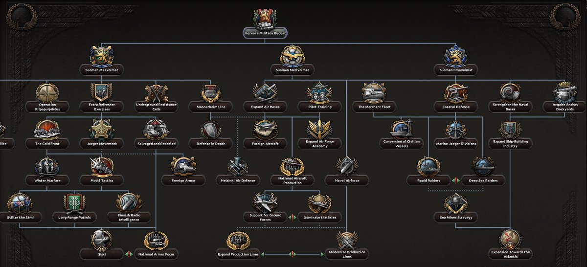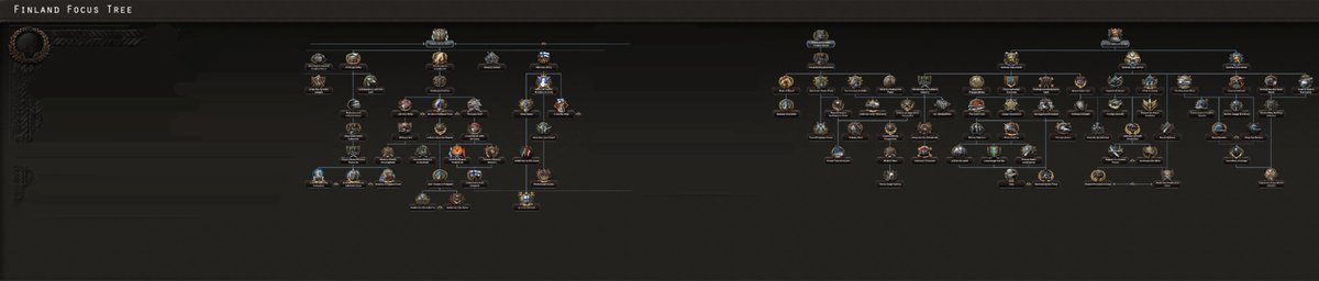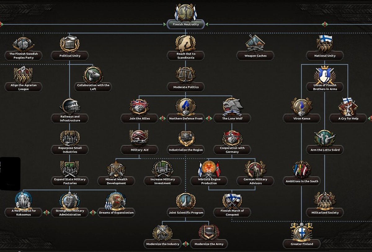Остаток подветки очень фашистский, фокусы в центральной части улучшают финскую армию, включая так нужные людские ресурсы, и военную промышленность. Левее «Viron Kansa», позволяет предложить объединиться с Эстонией, что приведёт к её аннексии или вхождению в альянс.