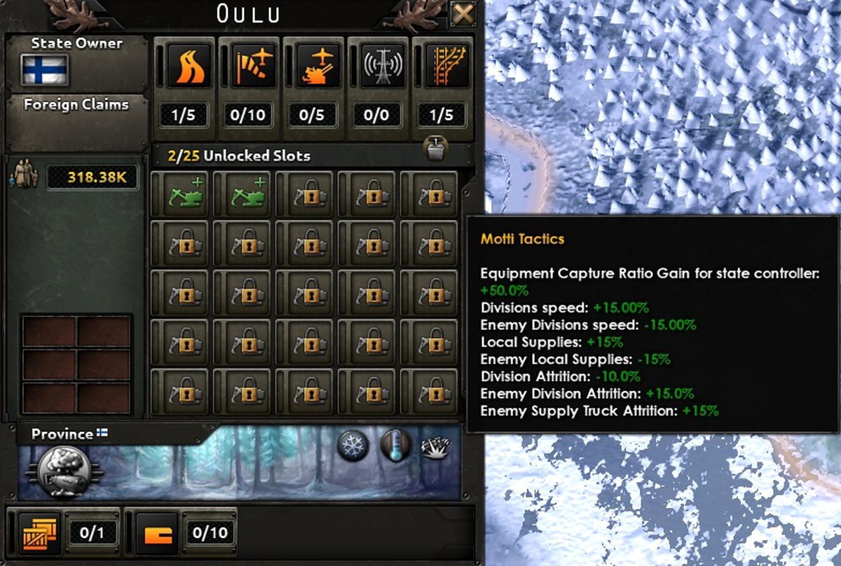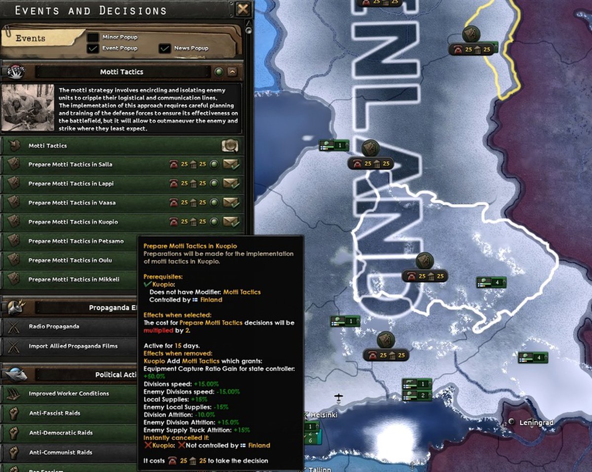 Можно отменить тактику «Мотти» в регионе, в котором она может быть не нужна, чтобы снизить стоимость вдвое. Заметьте, что модификатор действует только пока регион принадлежит Финляндии, если враг захватит территорию и контроль над регионом, то модификатор пропадёт, и стоимость последующих решений снизится.