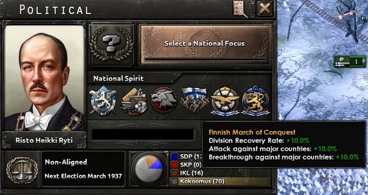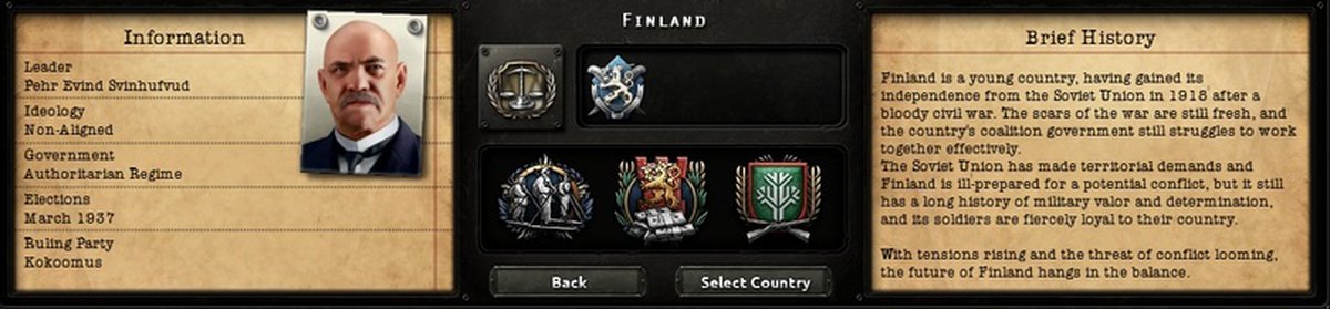 Сегодняшний дневник разработчиков посвящён историческим фокусам финнов. Ситуация их страны в 1936 году сложная: государство демократическое, но нацизм и правые идеологии набирают популярность; Аграрный союз, Национальная коалиция и Социал-демократическая партия борются за власть и не могут эффективно сотрудничать; отношения с СССР так себе; армия плохо оснащена и неподготовленна.