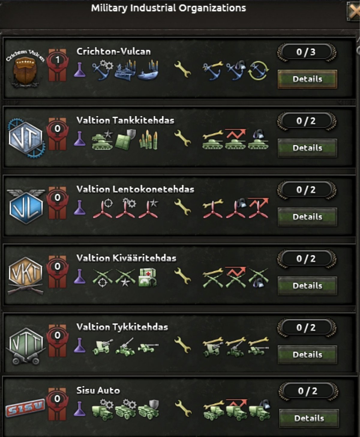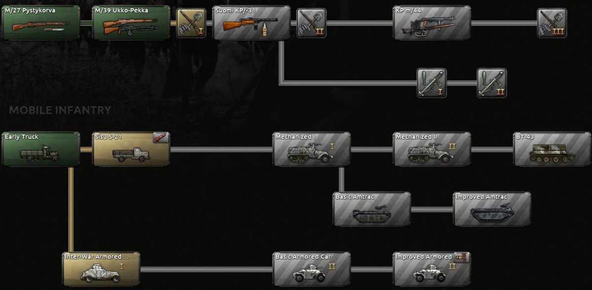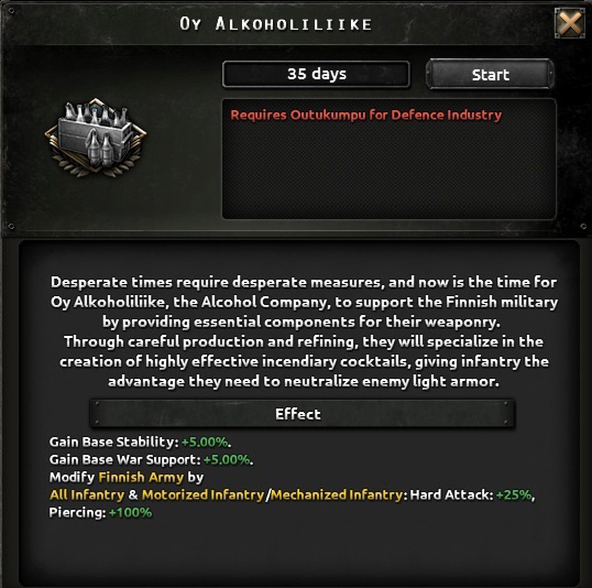 Самые правые фокусы, которые также относятся к ветке армии, больше сфокусированы на военной промышленности, включая улучшение вашего пехотного снаряжения и артиллерийских ВПО и, даже предоставляя один из главных символов Зимней войны — коктейль Молотова: