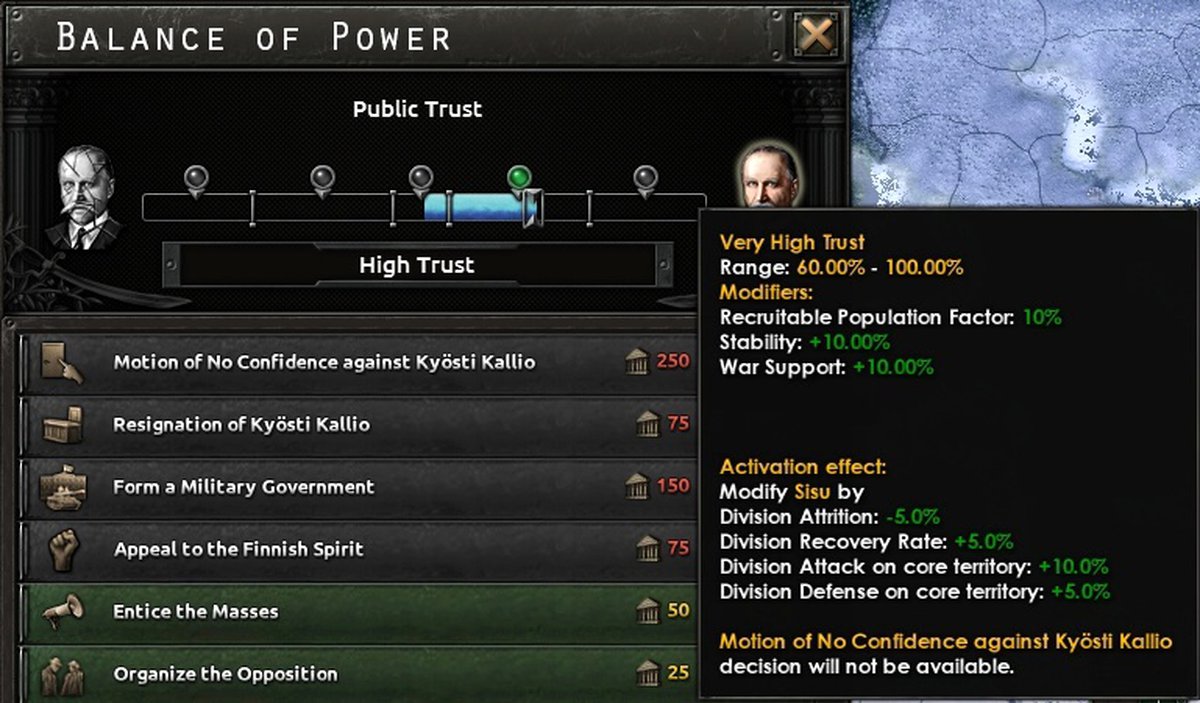 Появится механика баланса сил - народного доверия. Низкий показатель даёт штрафы к стабильности, поддержке войны и приросту политической власти. Высокое, наоборот, бонусы. Также у доверия есть уровни, которые влияют на бонусы нац. духа «Сису».